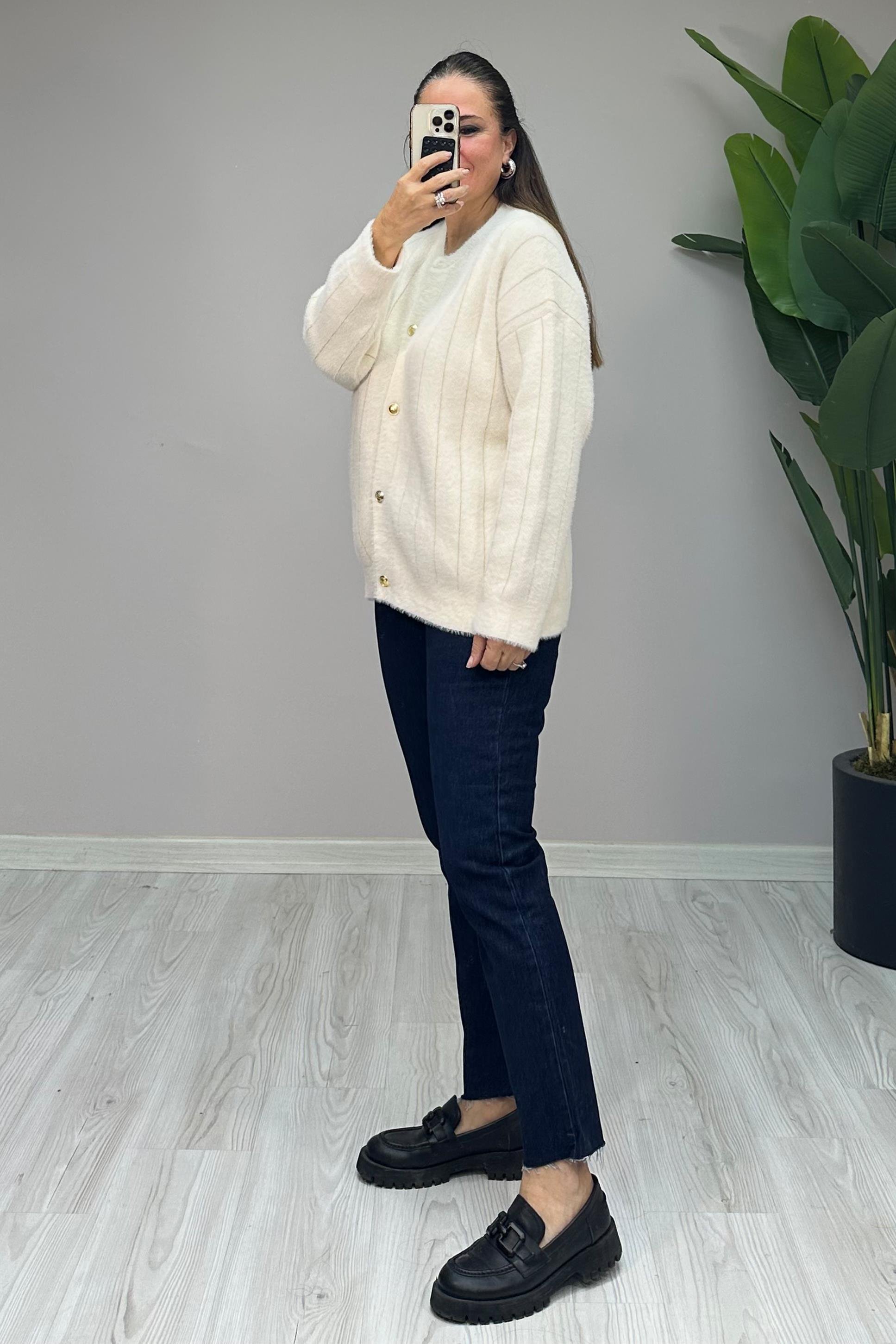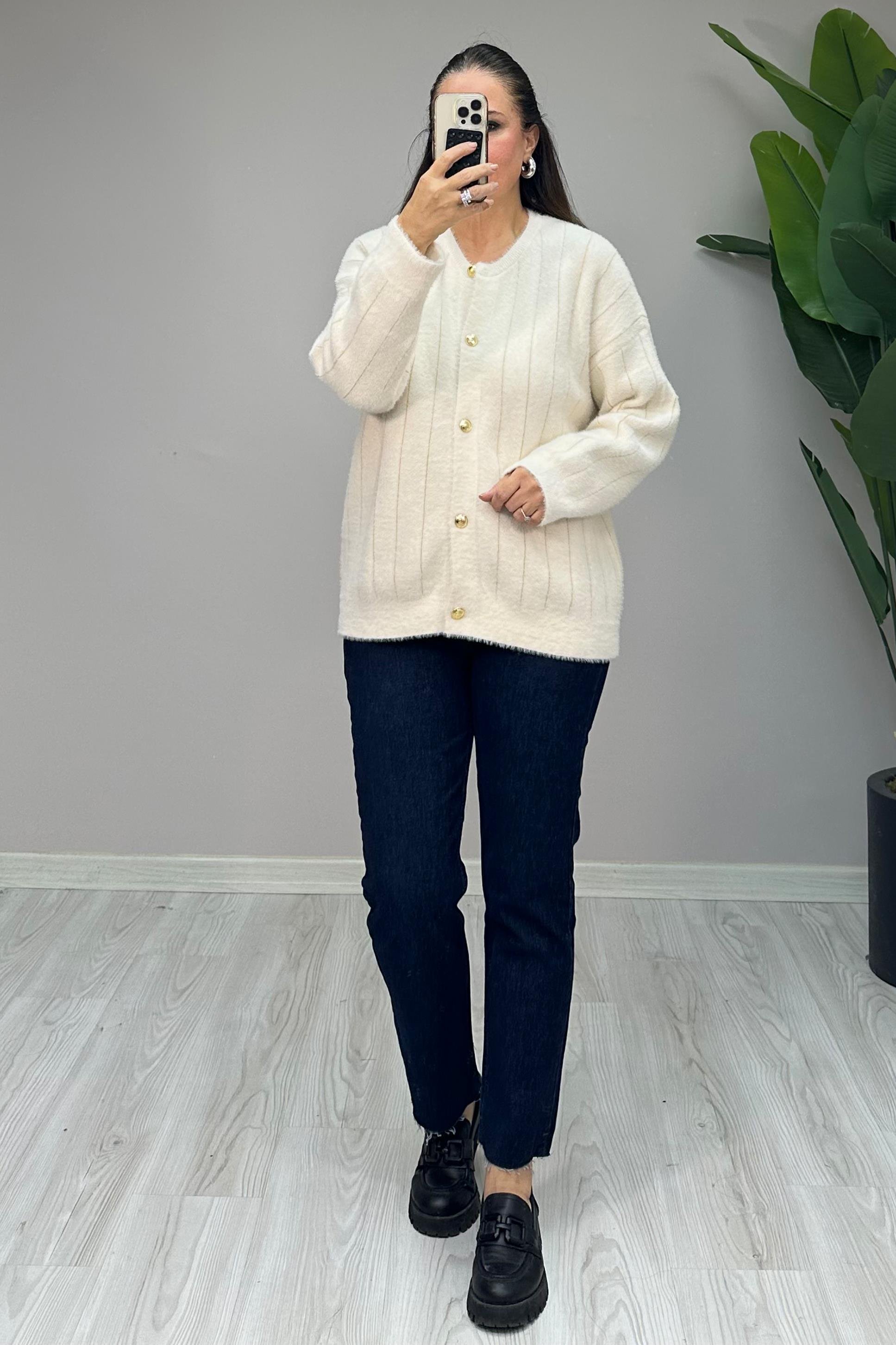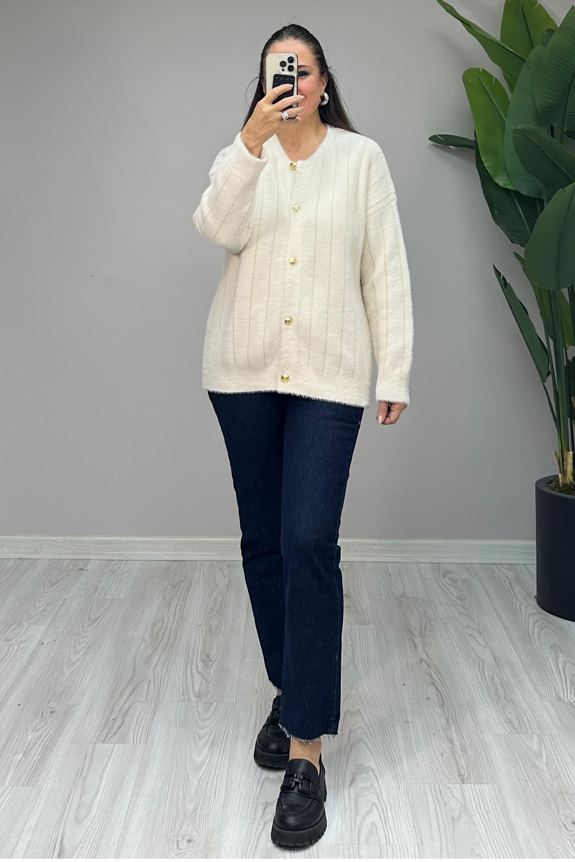 Standart bedendir. 36-48 beden arası uyumludur. Önden gold düğmelidir. Angora kumaştır. Boy: 64 cm Göğüs: 124 cm Kol Boy: 45 cm