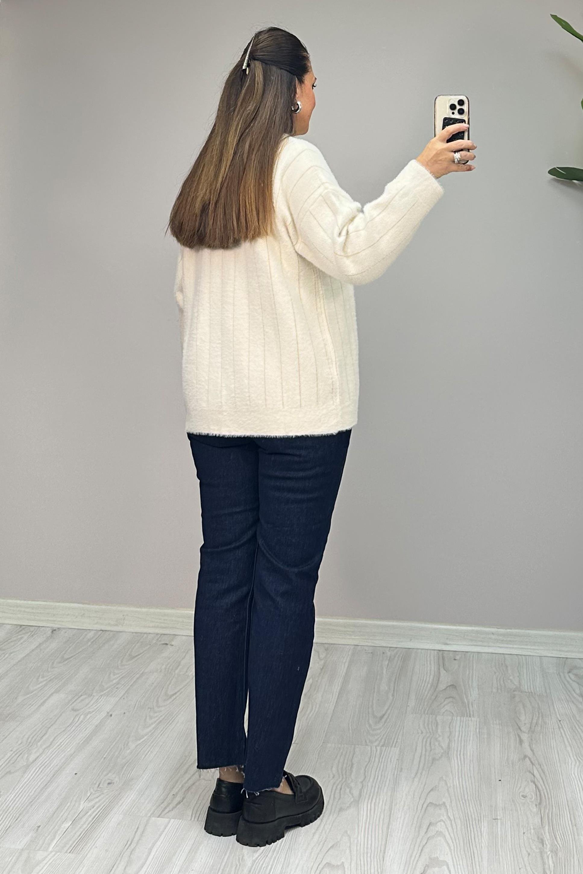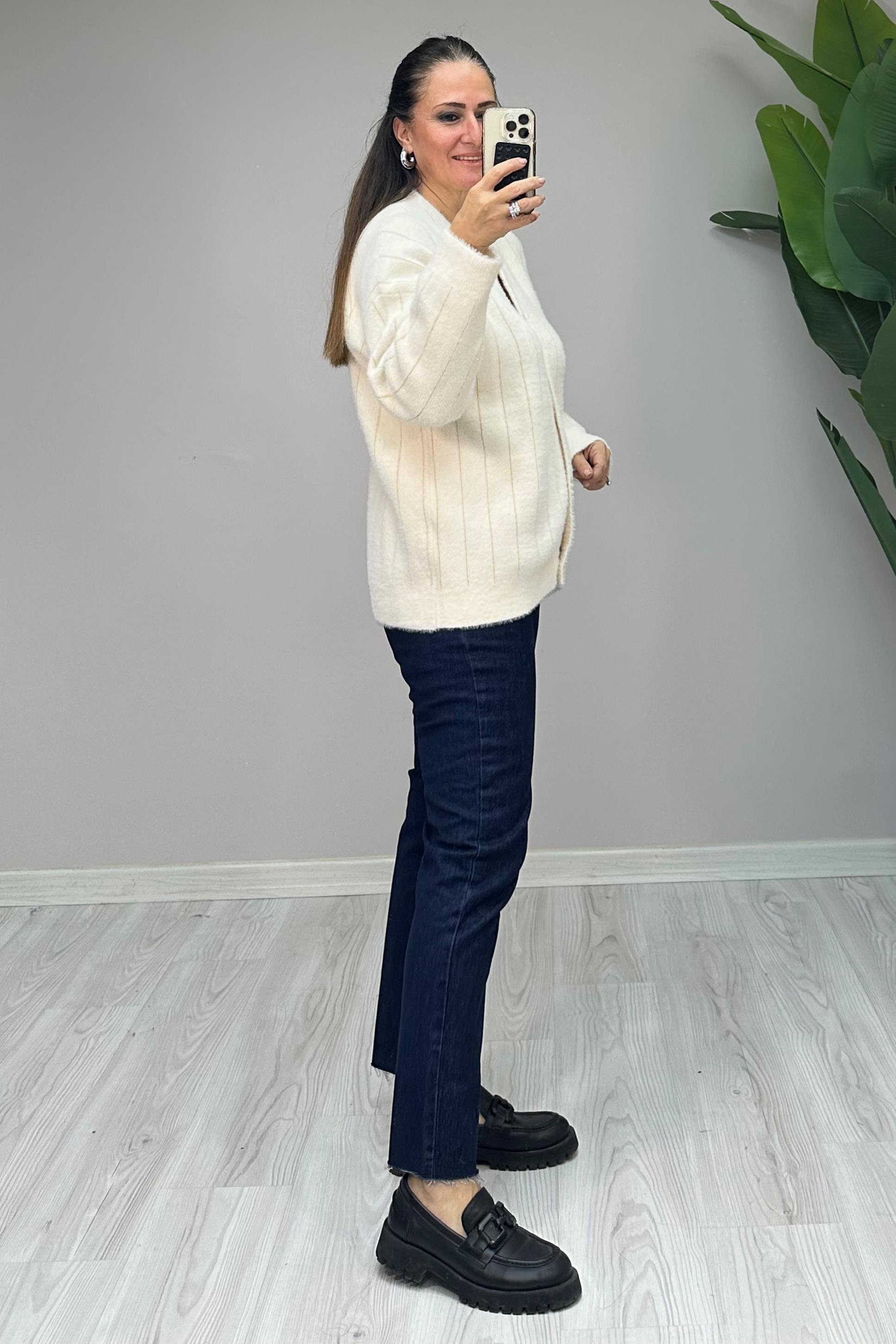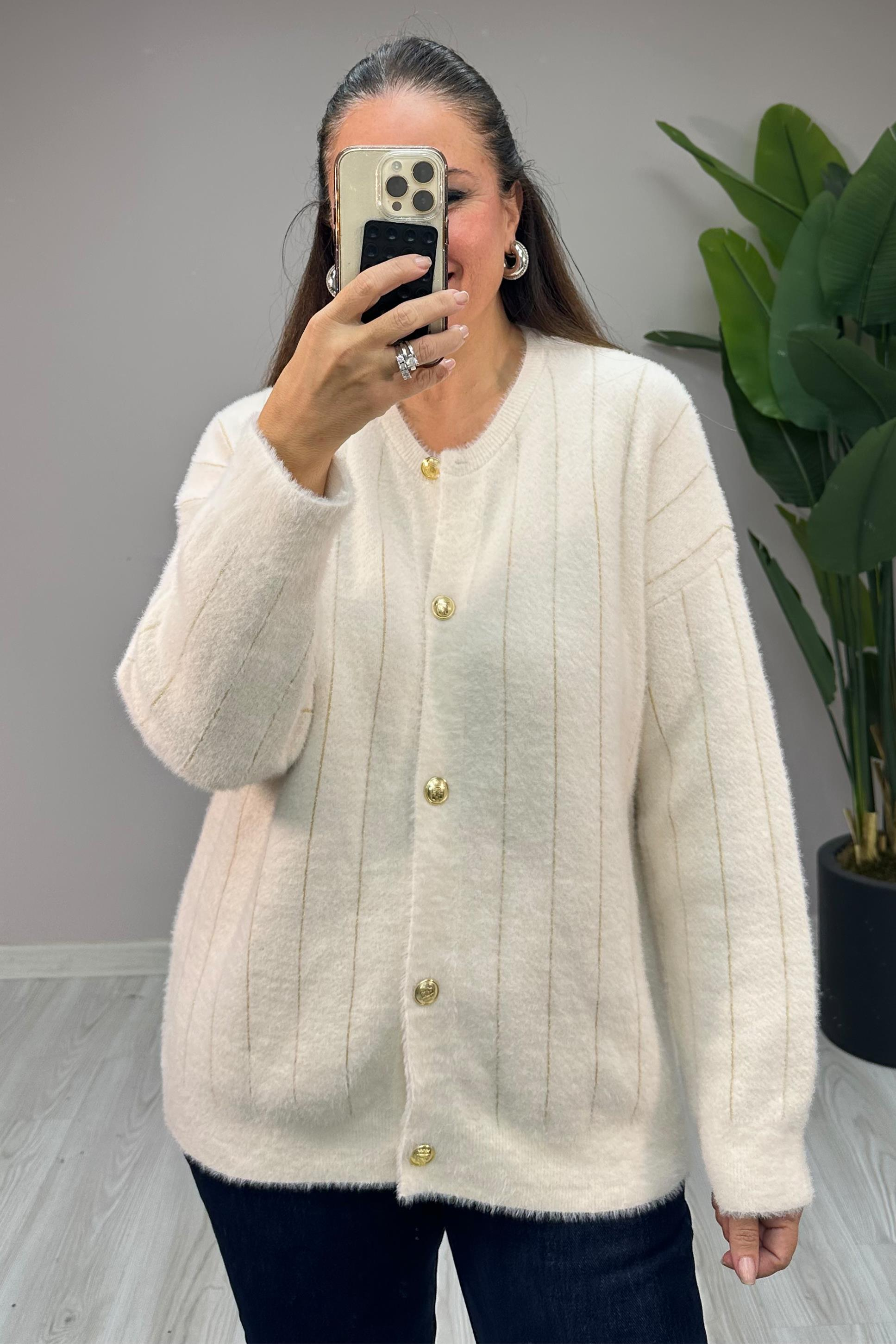 Standart bedendir. 36-48 beden arası uyumludur. Önden gold düğmelidir. Angora kumaştır. Boy: 64 cm Göğüs: 124 cm Kol Boy: 45 cm