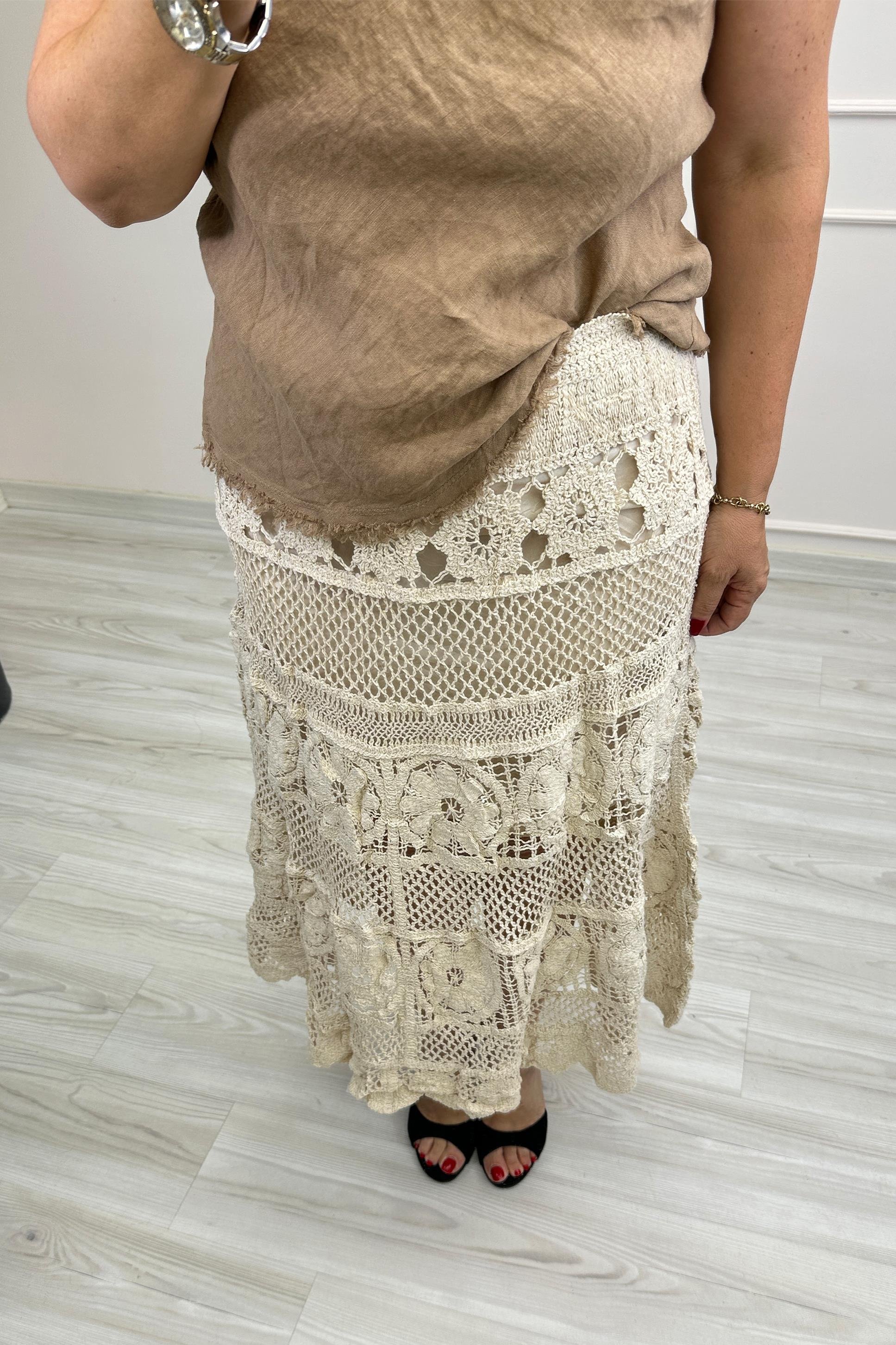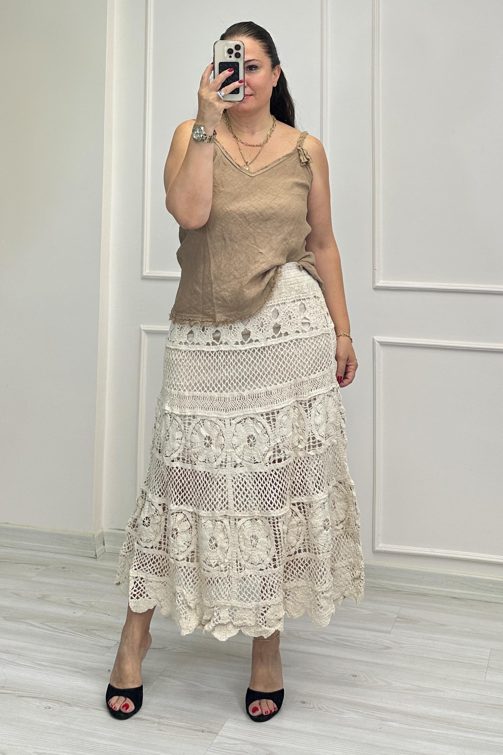 Dantel kumaştır. Standart bedendir. 36-46 beden arası uyumludur. Beli lastiklidir. Basen: 146 cm Boy: 95 cm