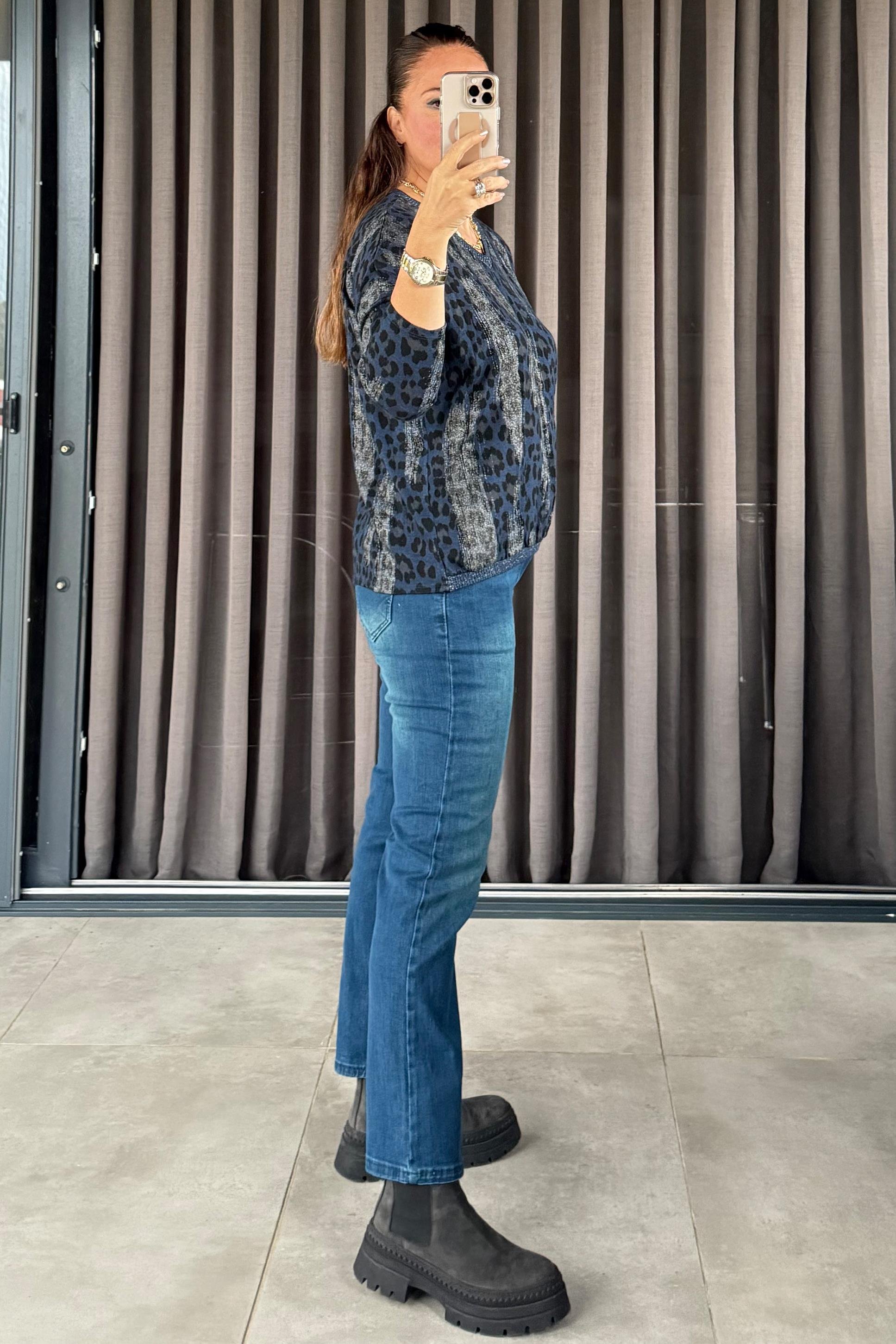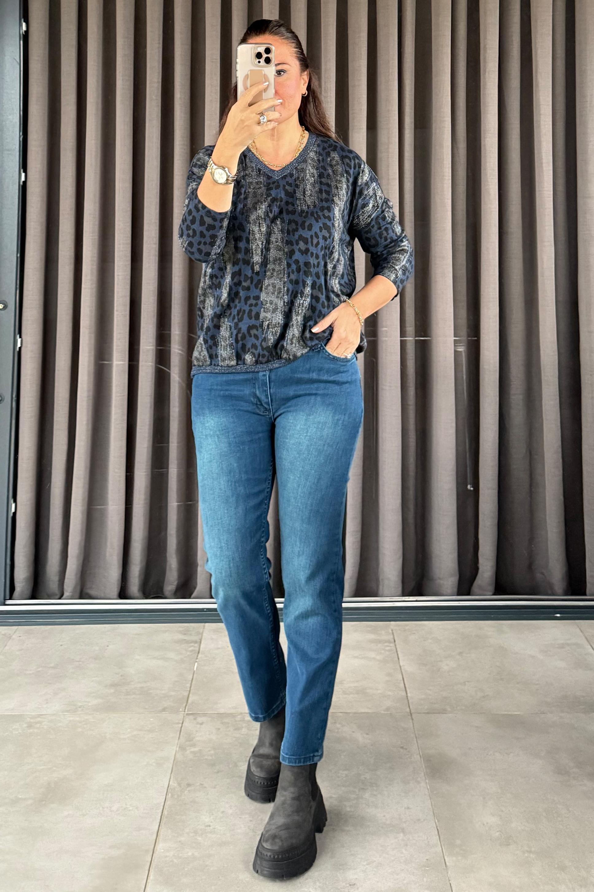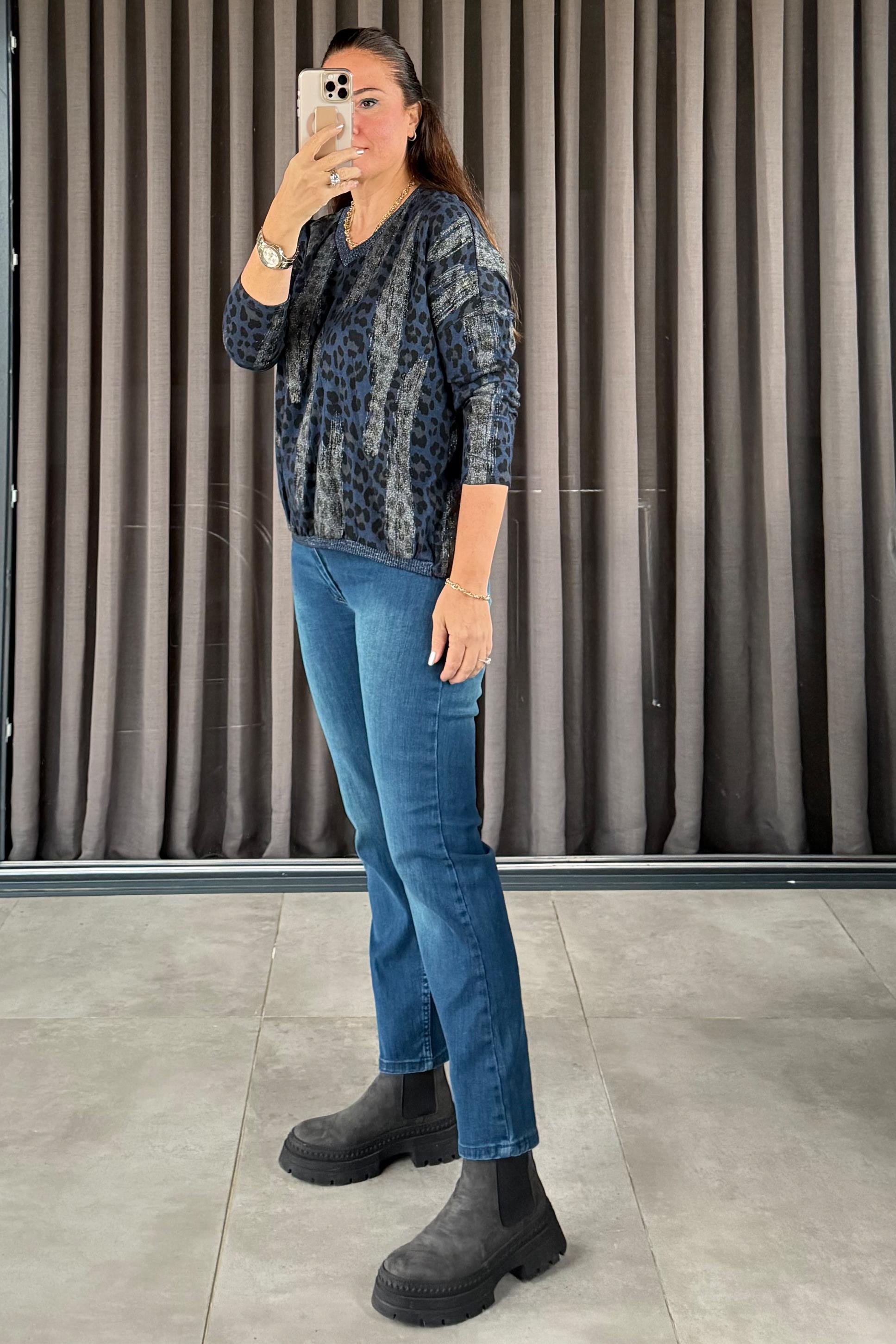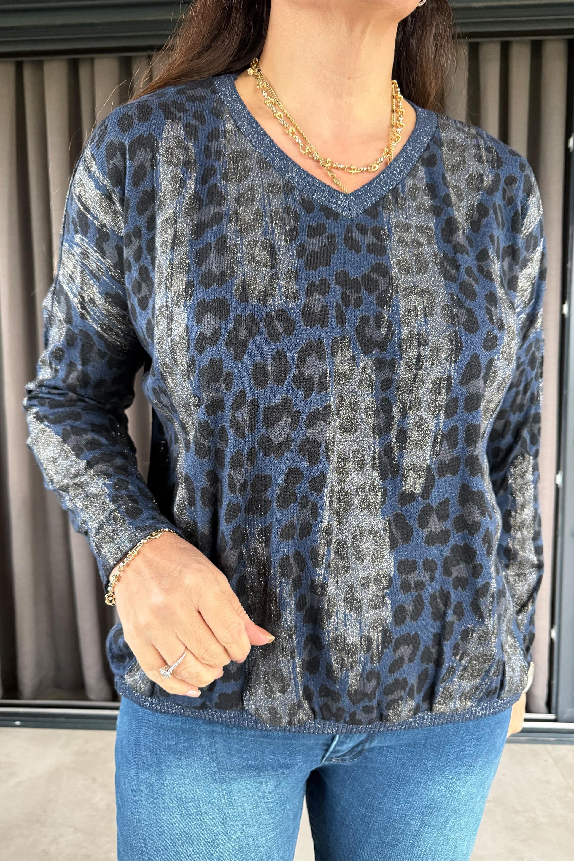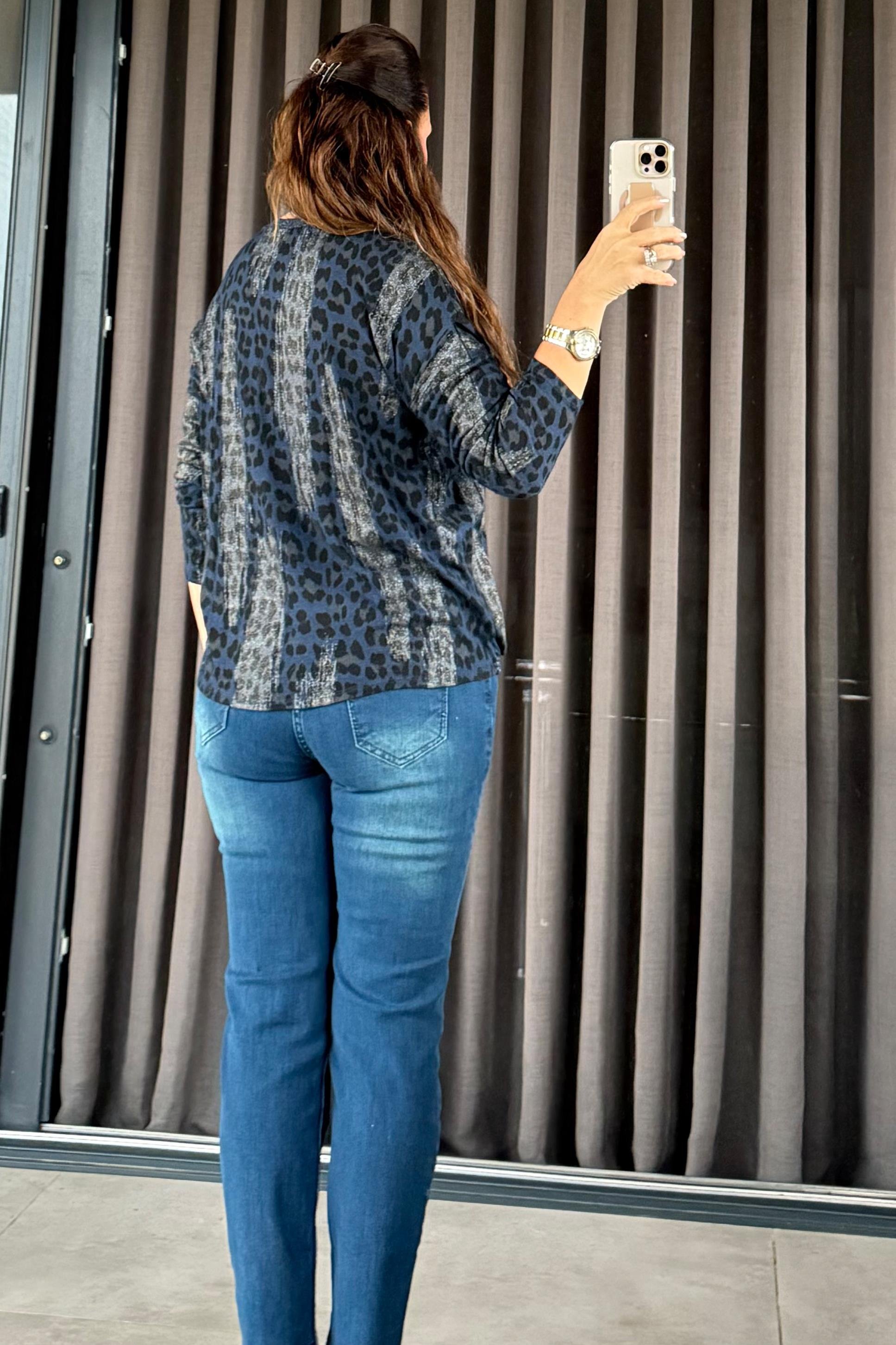 Fiera Leopar Desenli Triko Bluz Lacivert