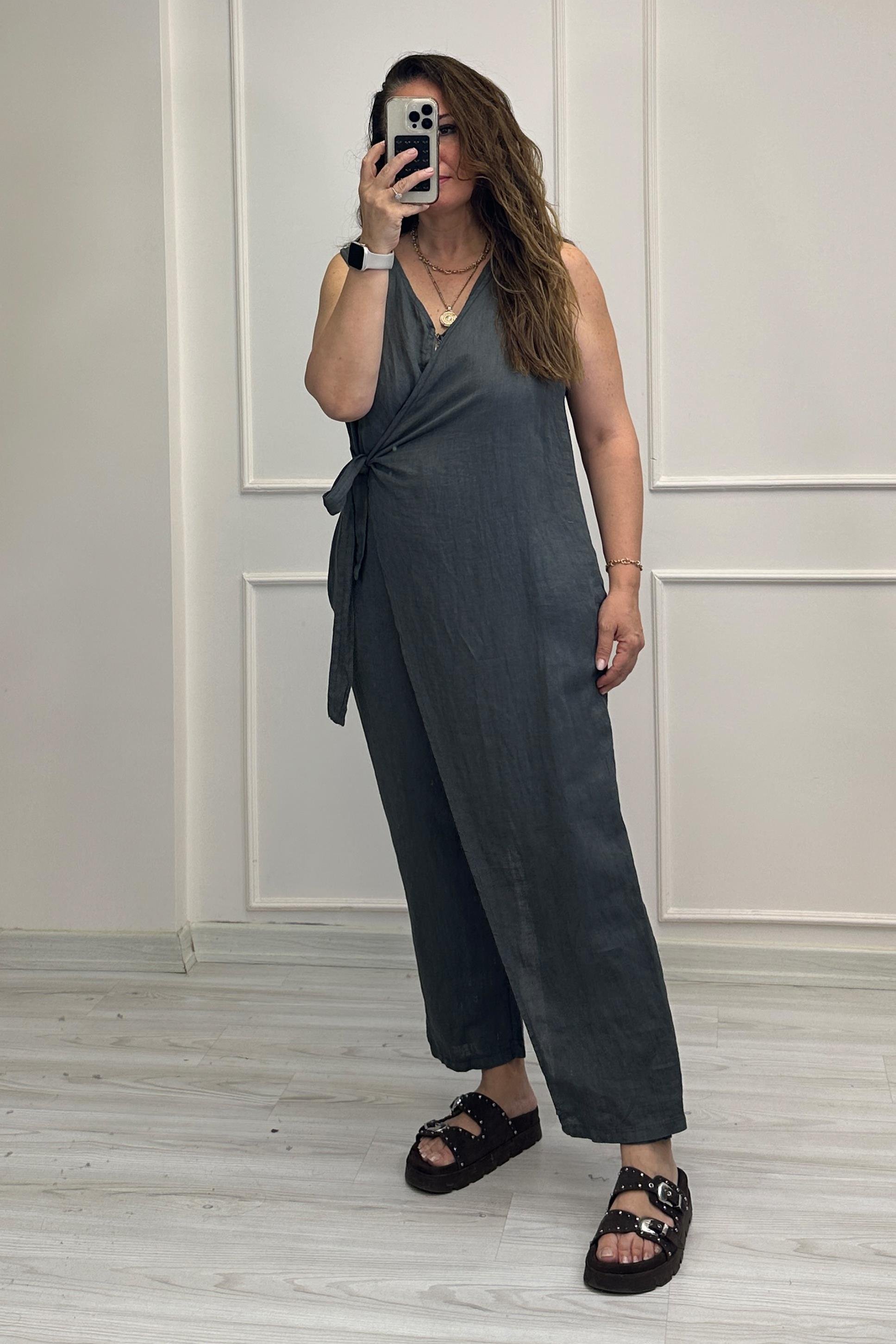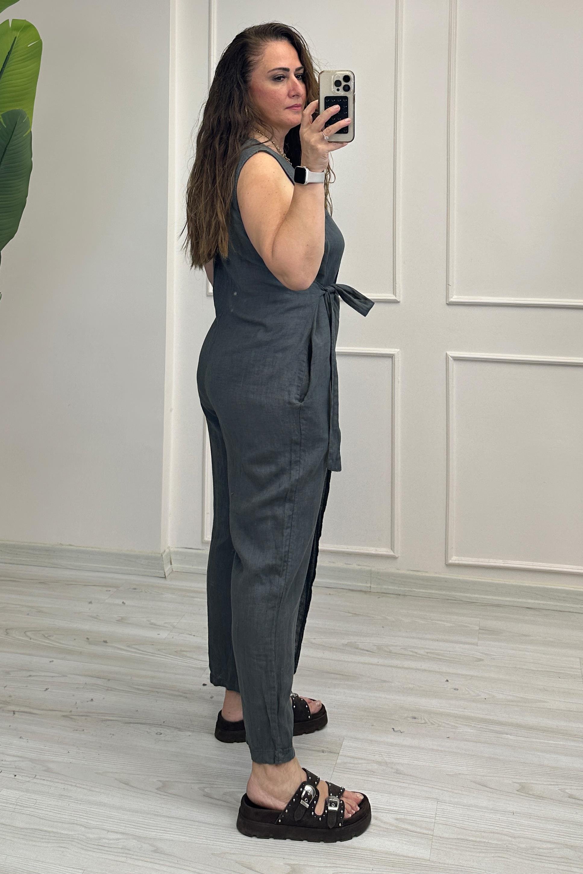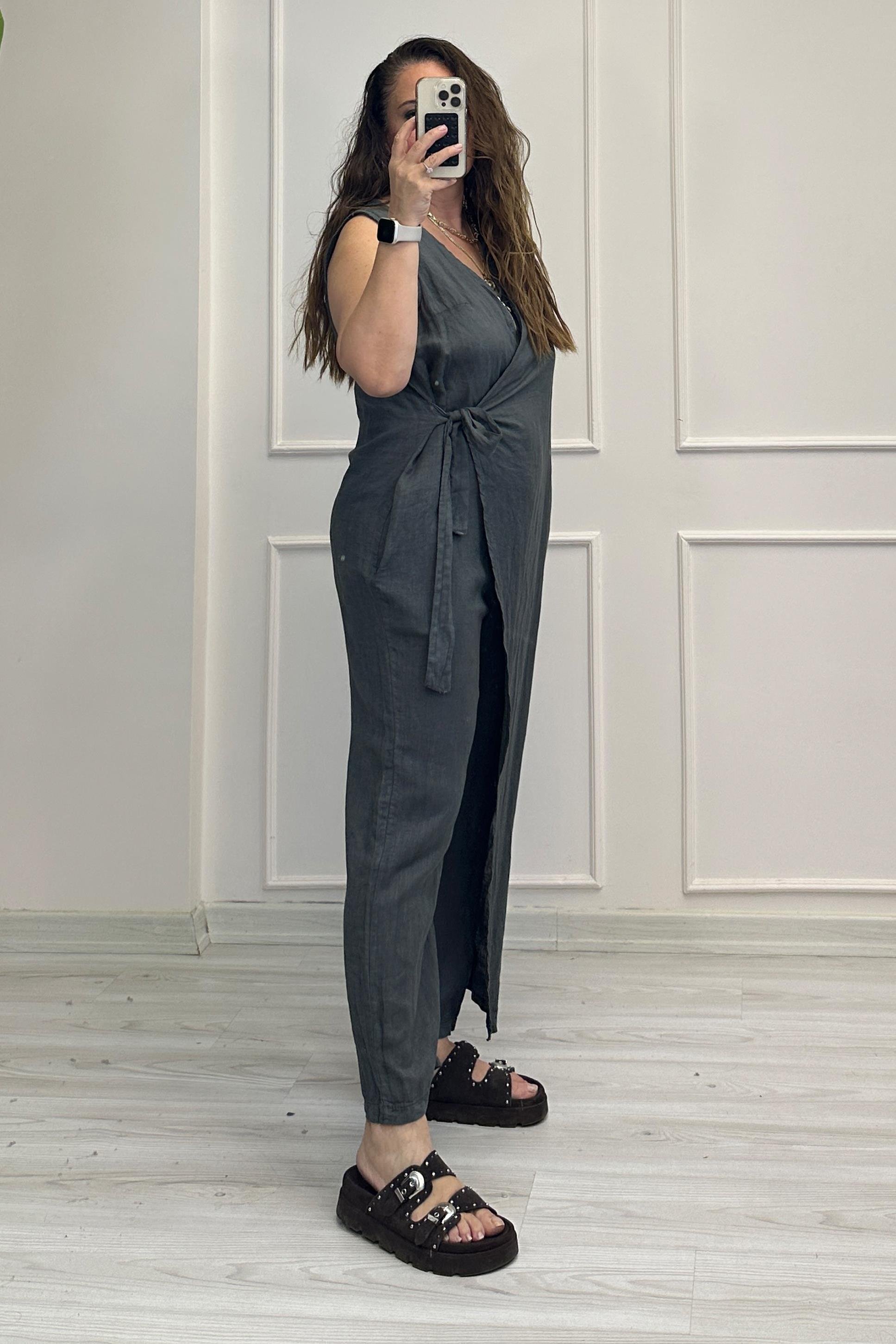 Jennifer Ön Bağlamalı Keten Tulum Gri