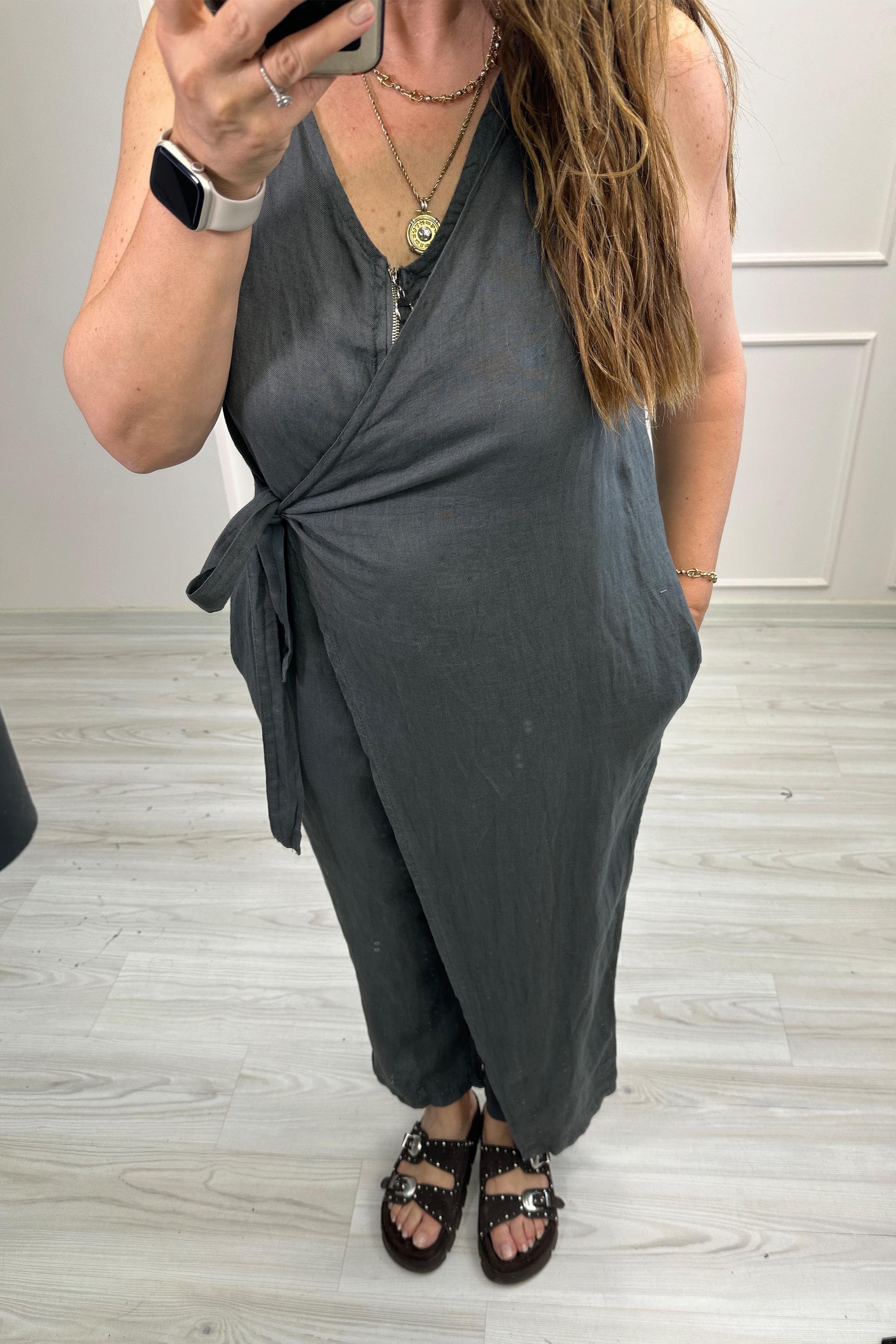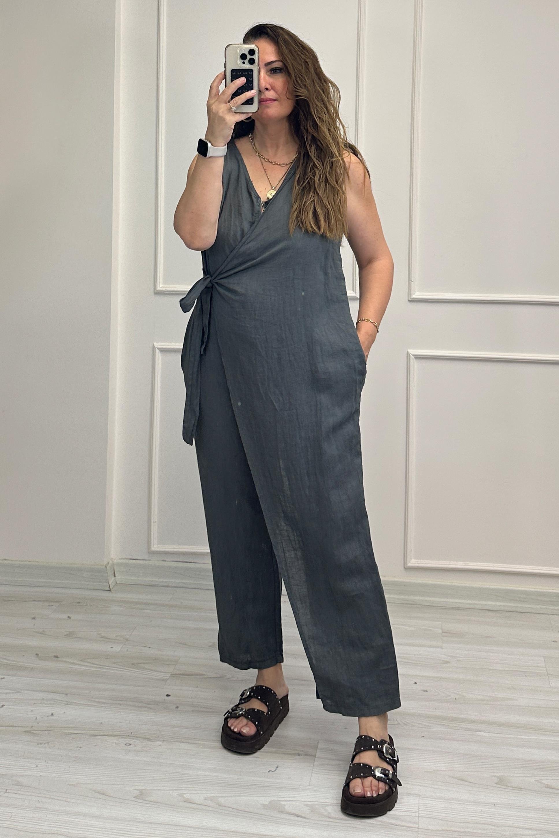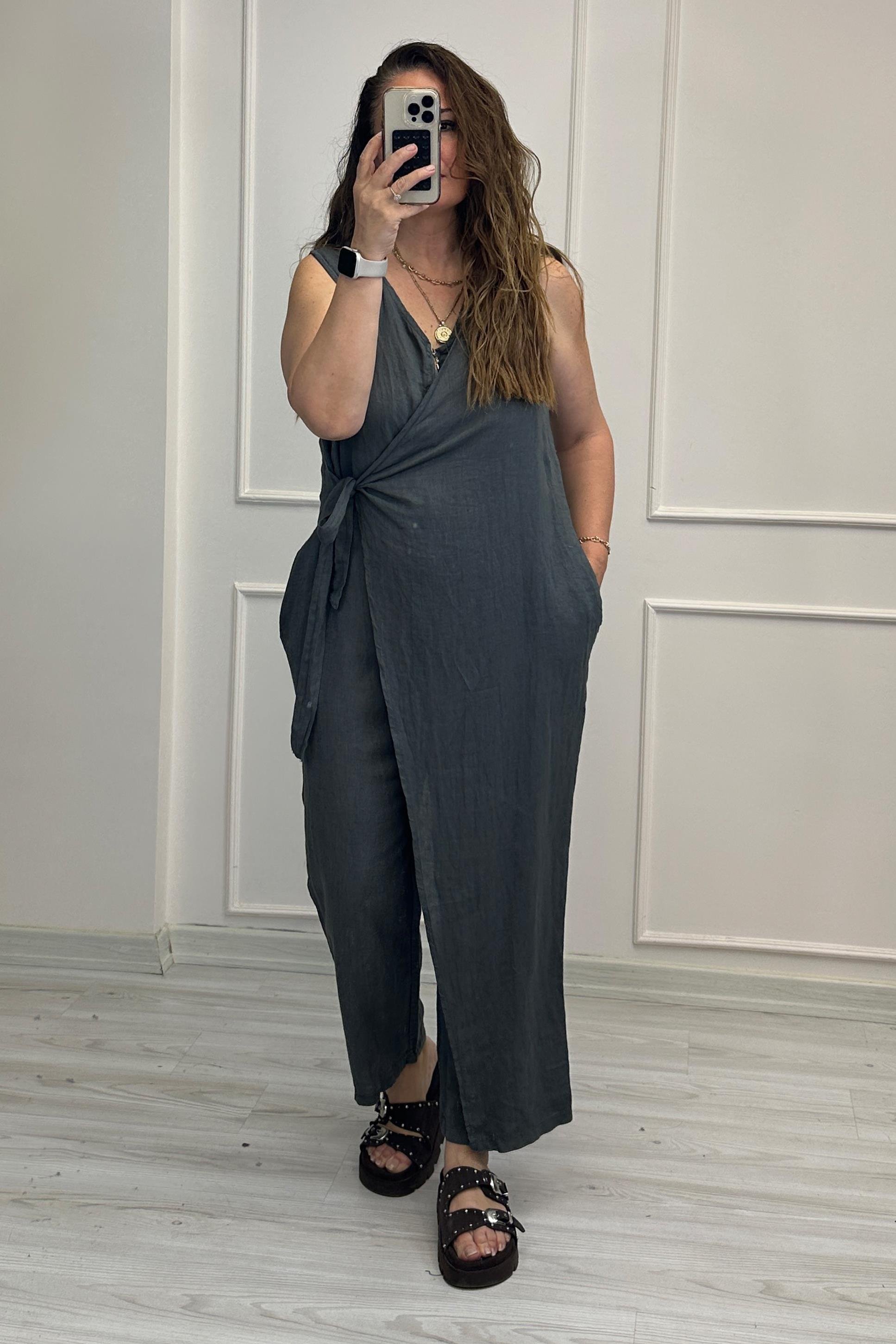 Jennifer Ön Bağlamalı Keten Tulum Gri