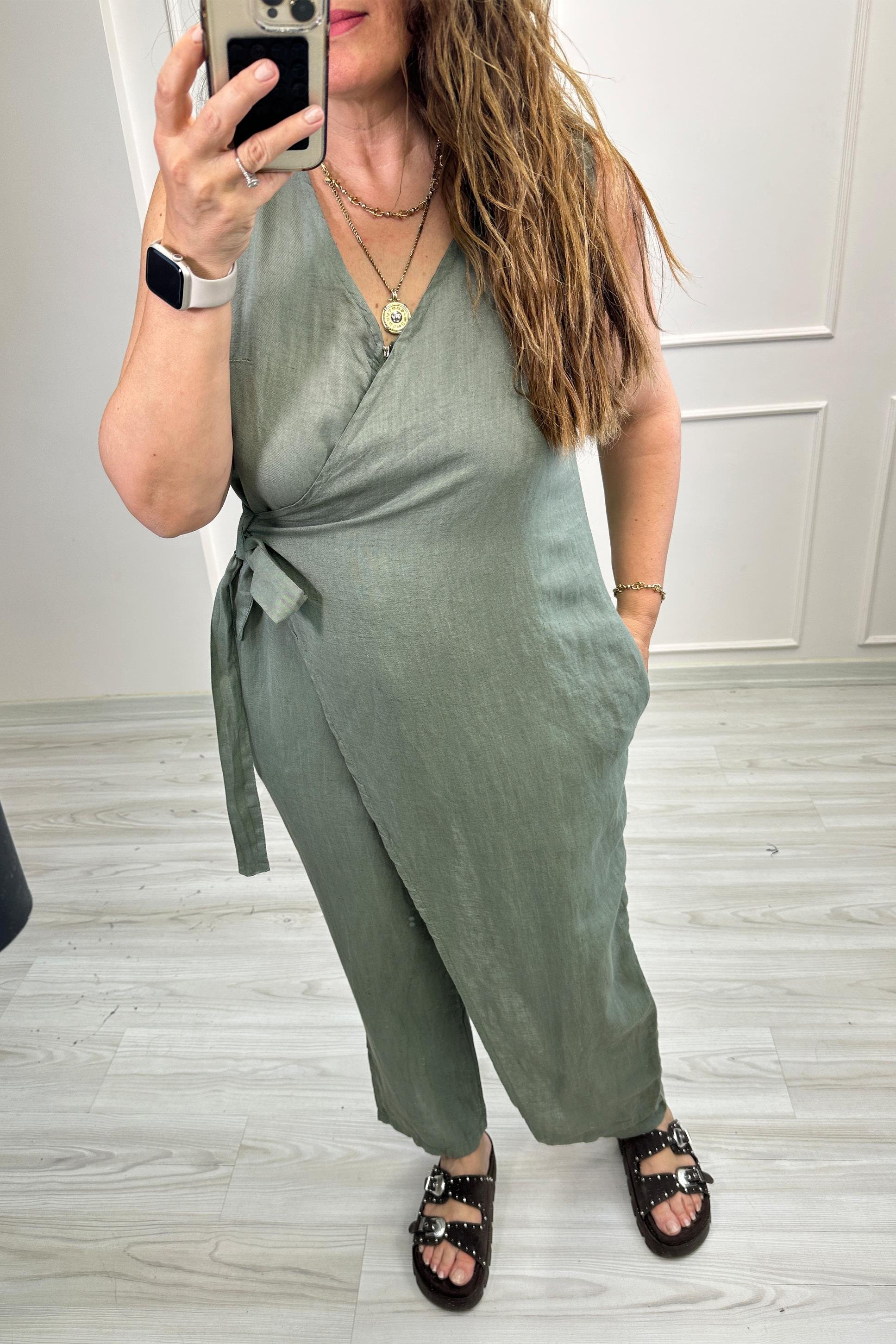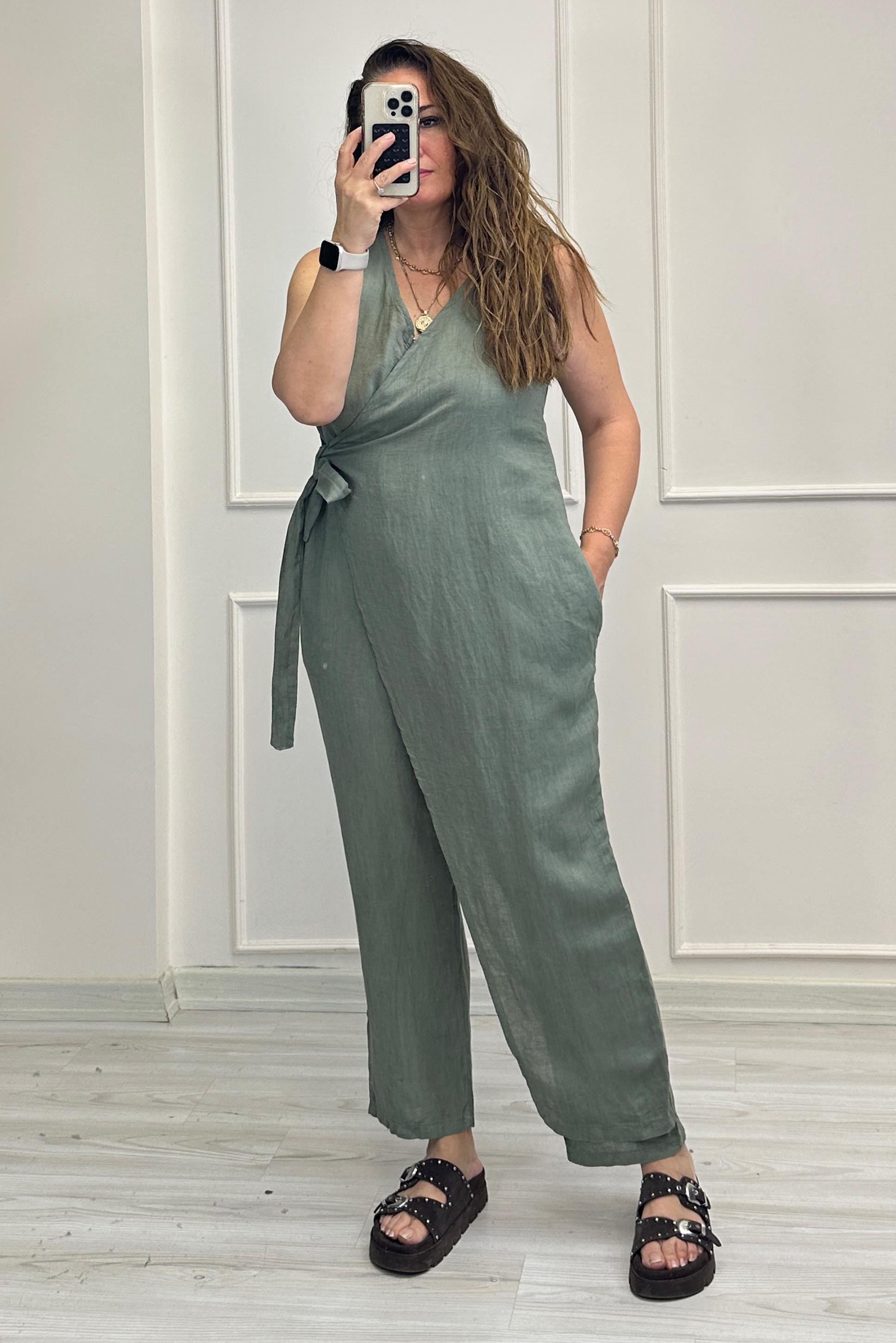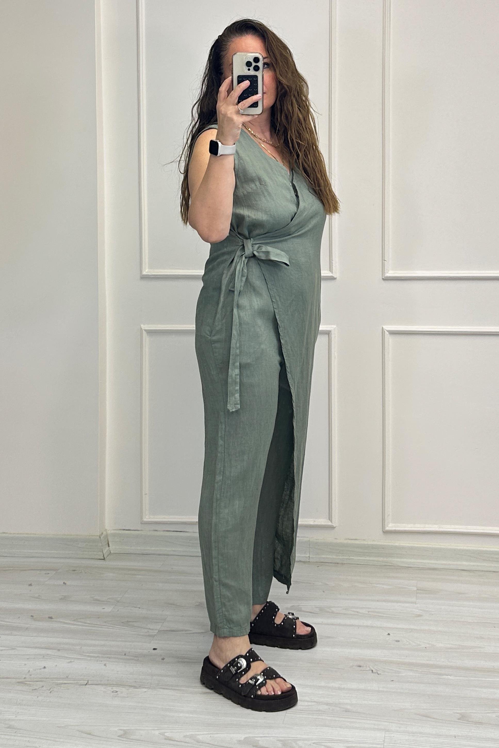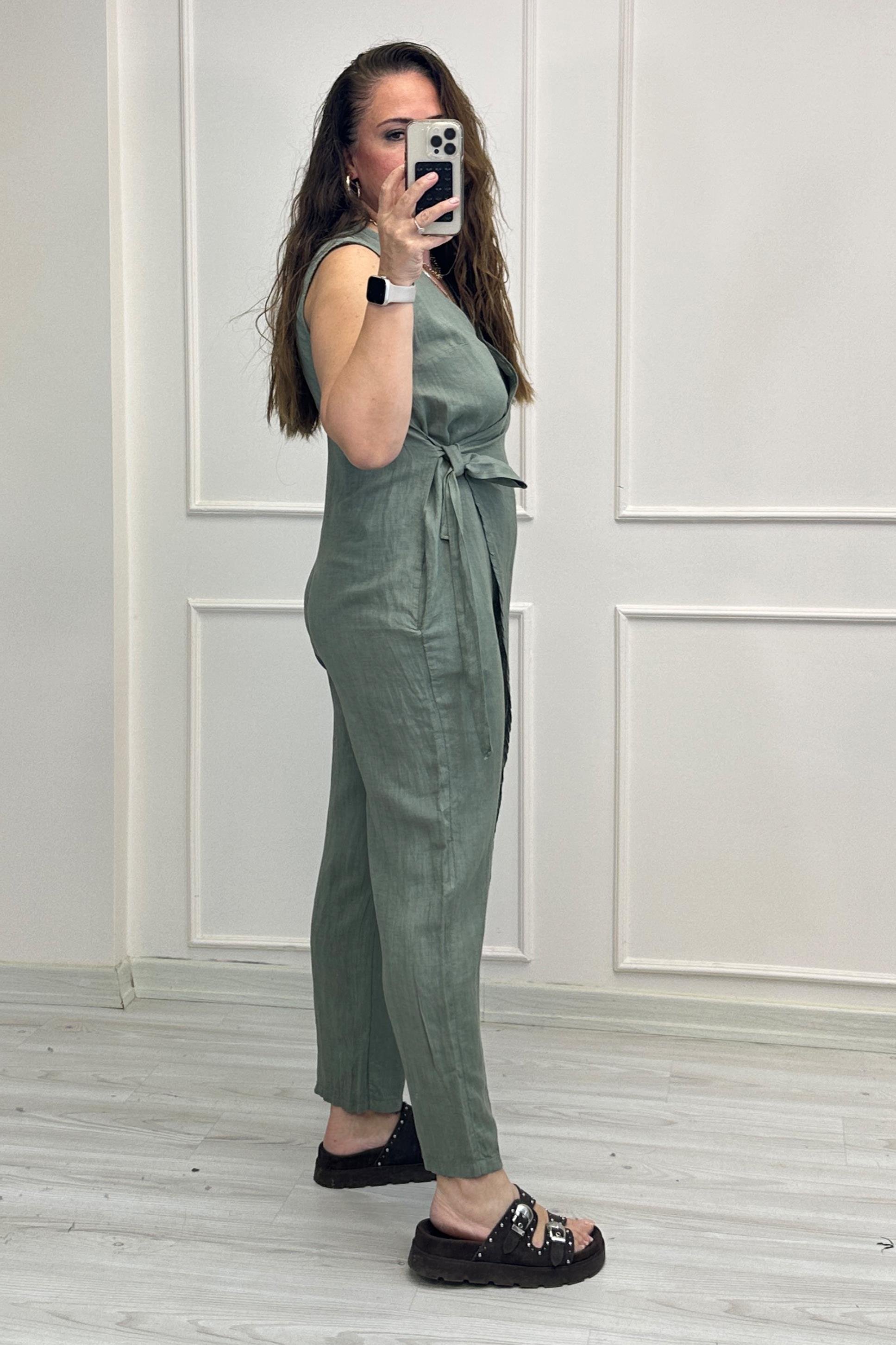 Jennifer Ön Bağlamalı Keten Tulum Haki