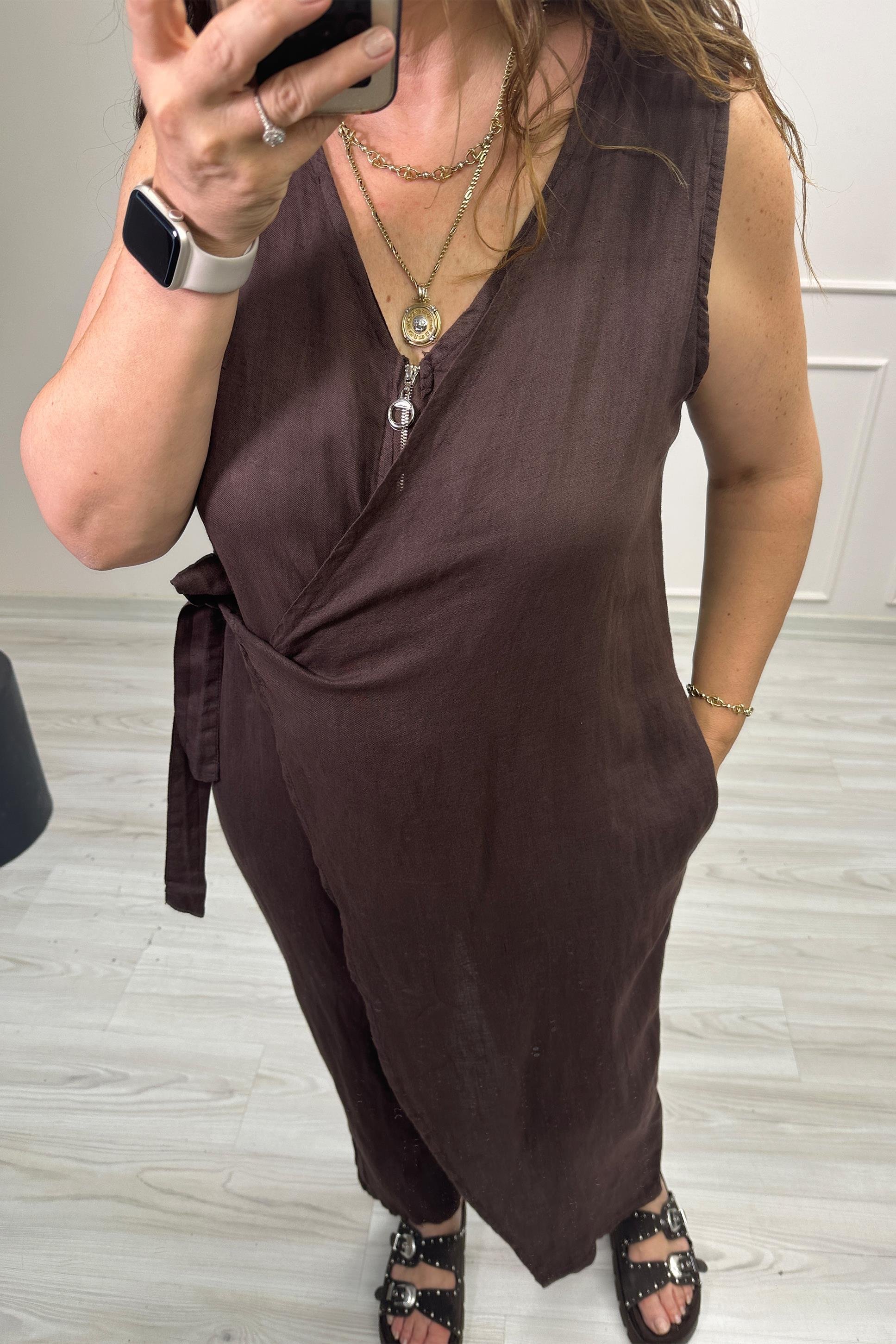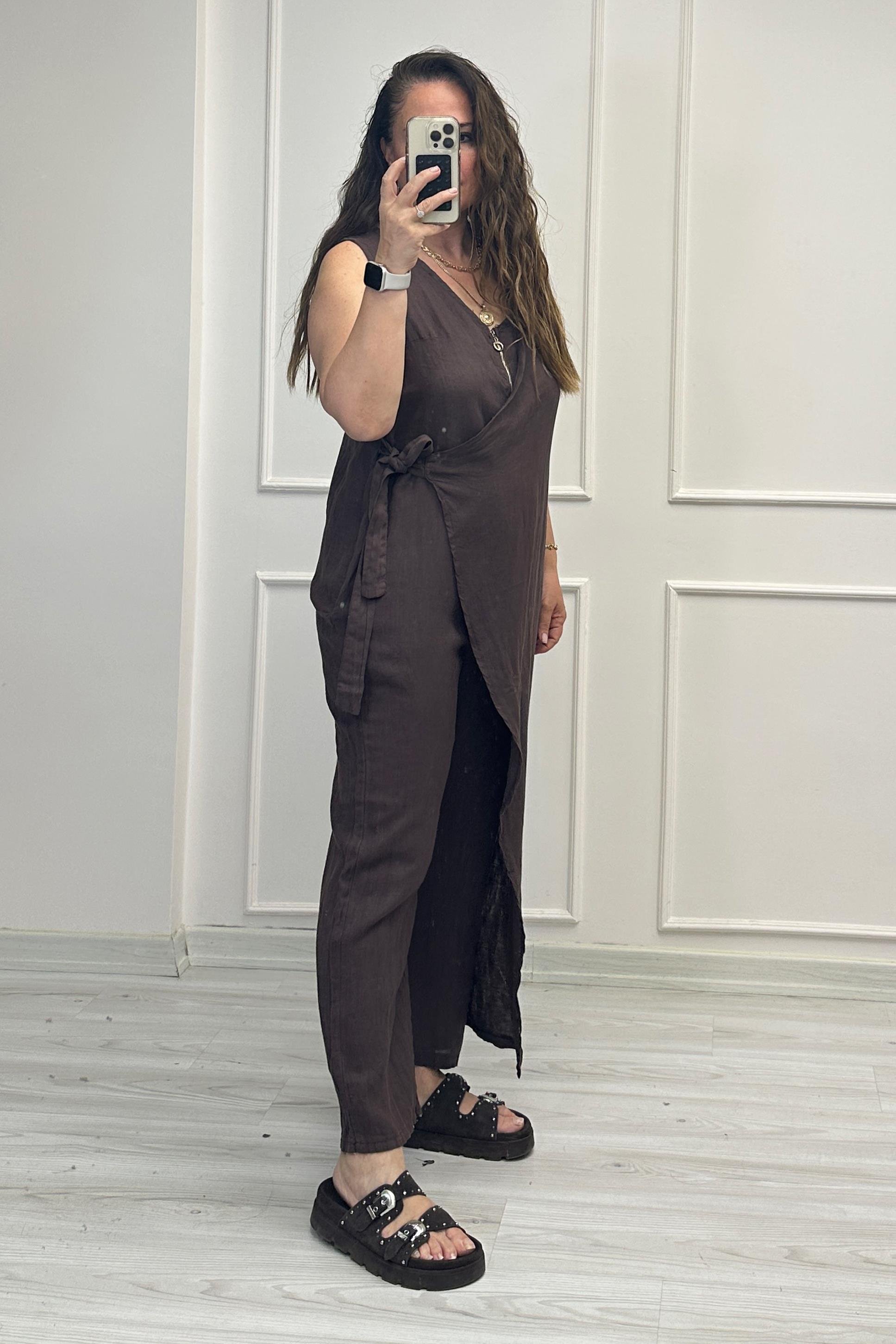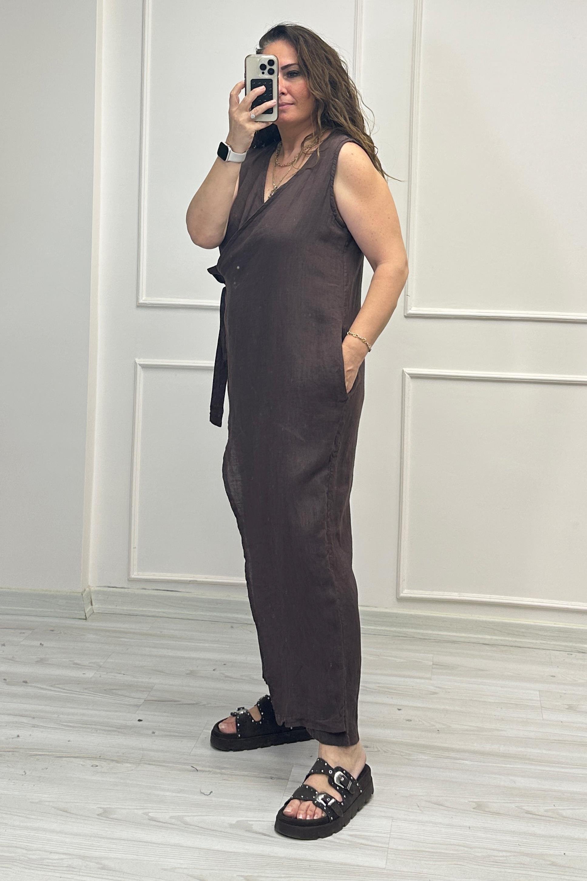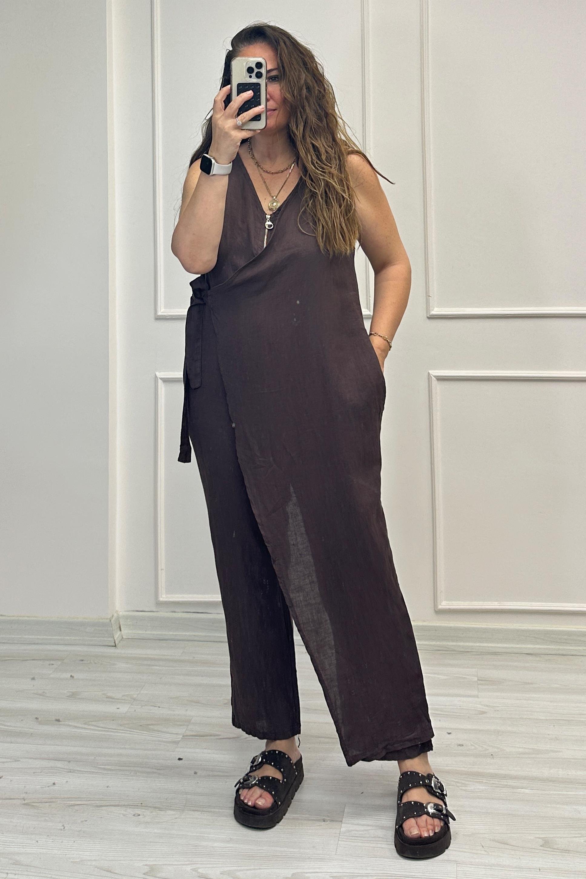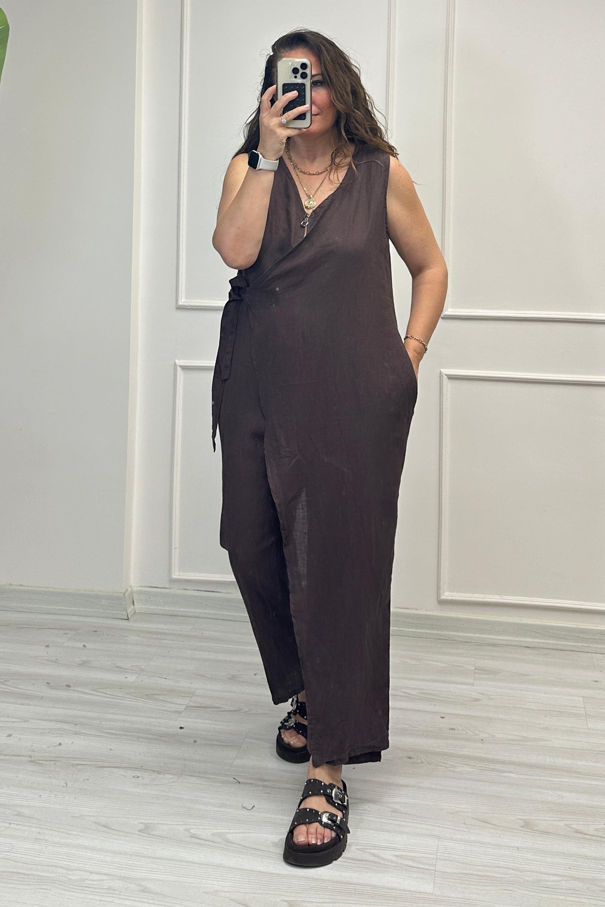 Jennifer Ön Bağlamalı Keten Tulum Kahve
