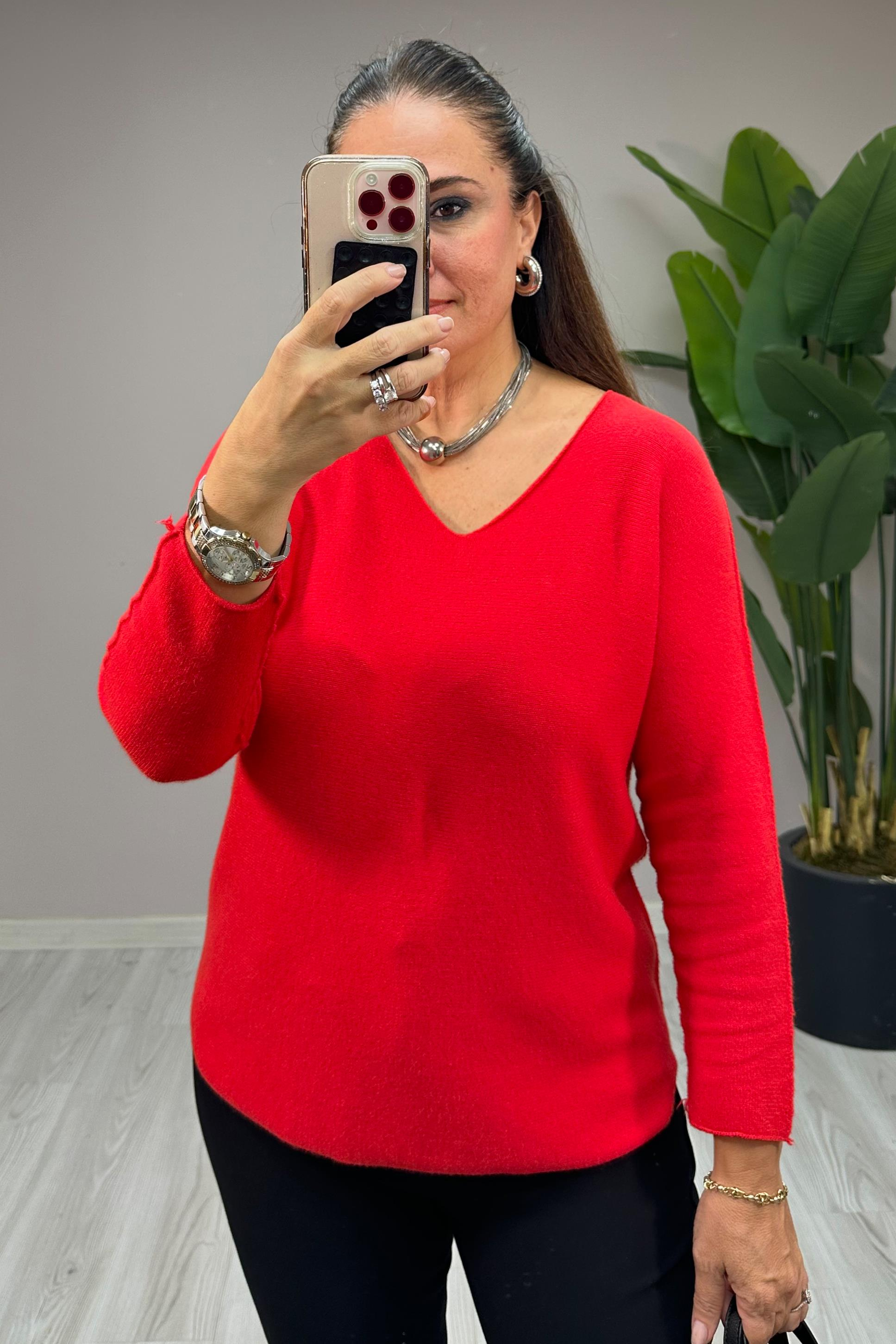 Nicel V Yaka Triko Kazak Kırmızı
