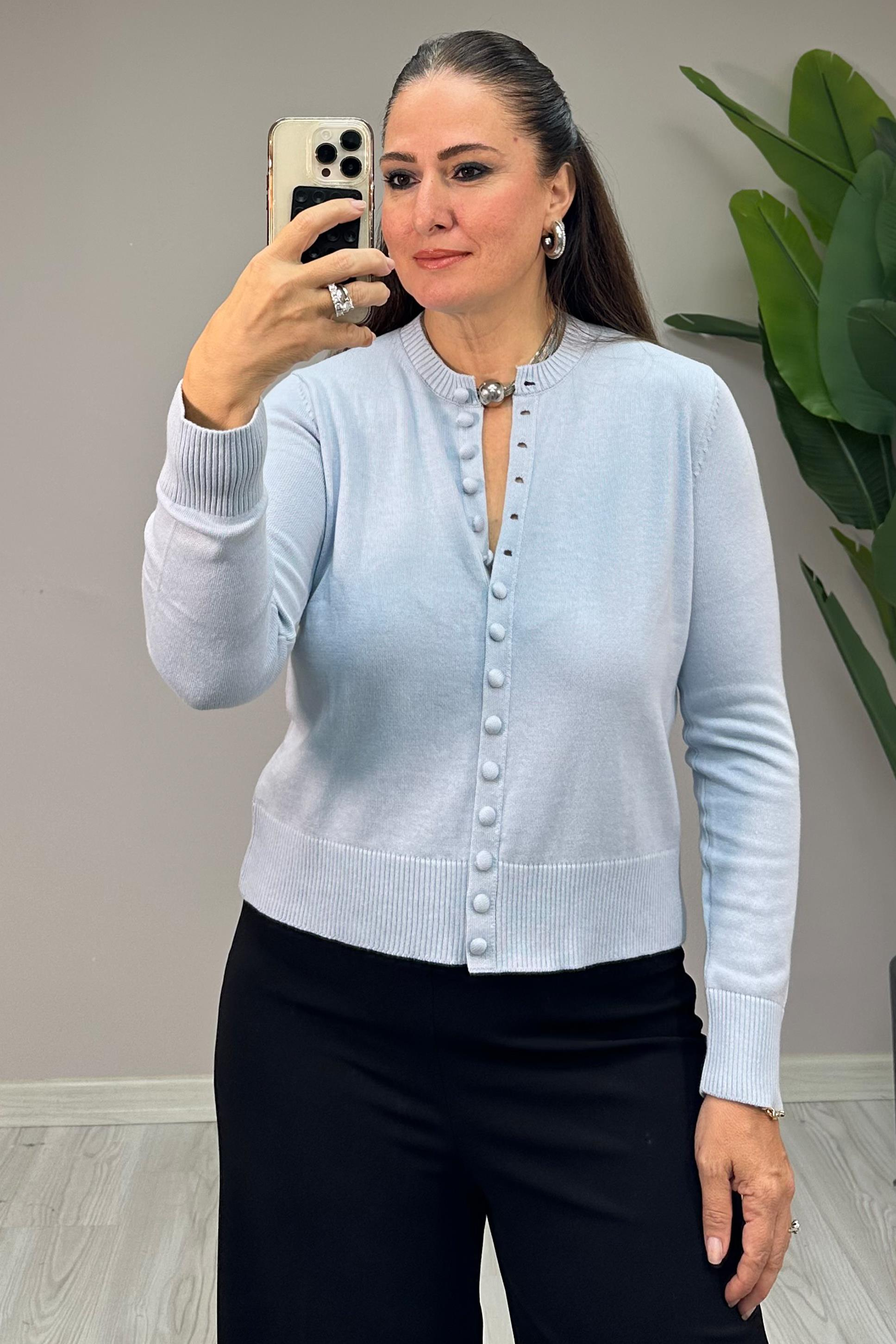 Pesta Düğmeli Triko Bluz Mavi