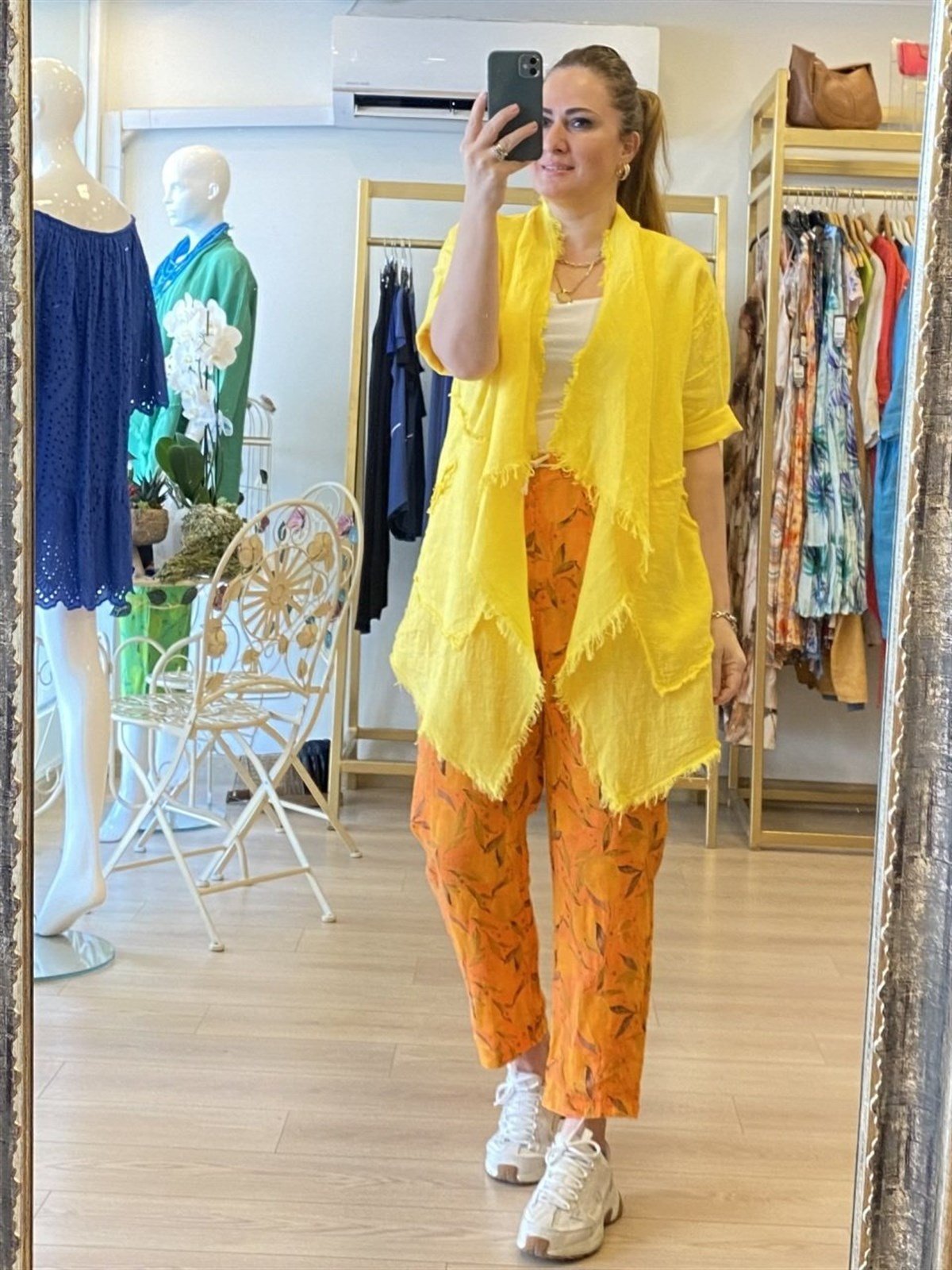 Püskül detaylı keten ceket sarı