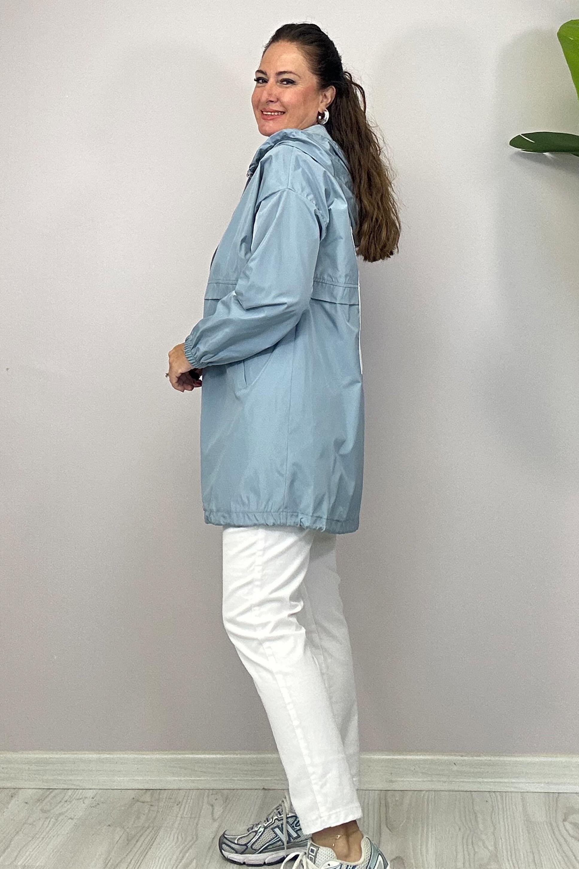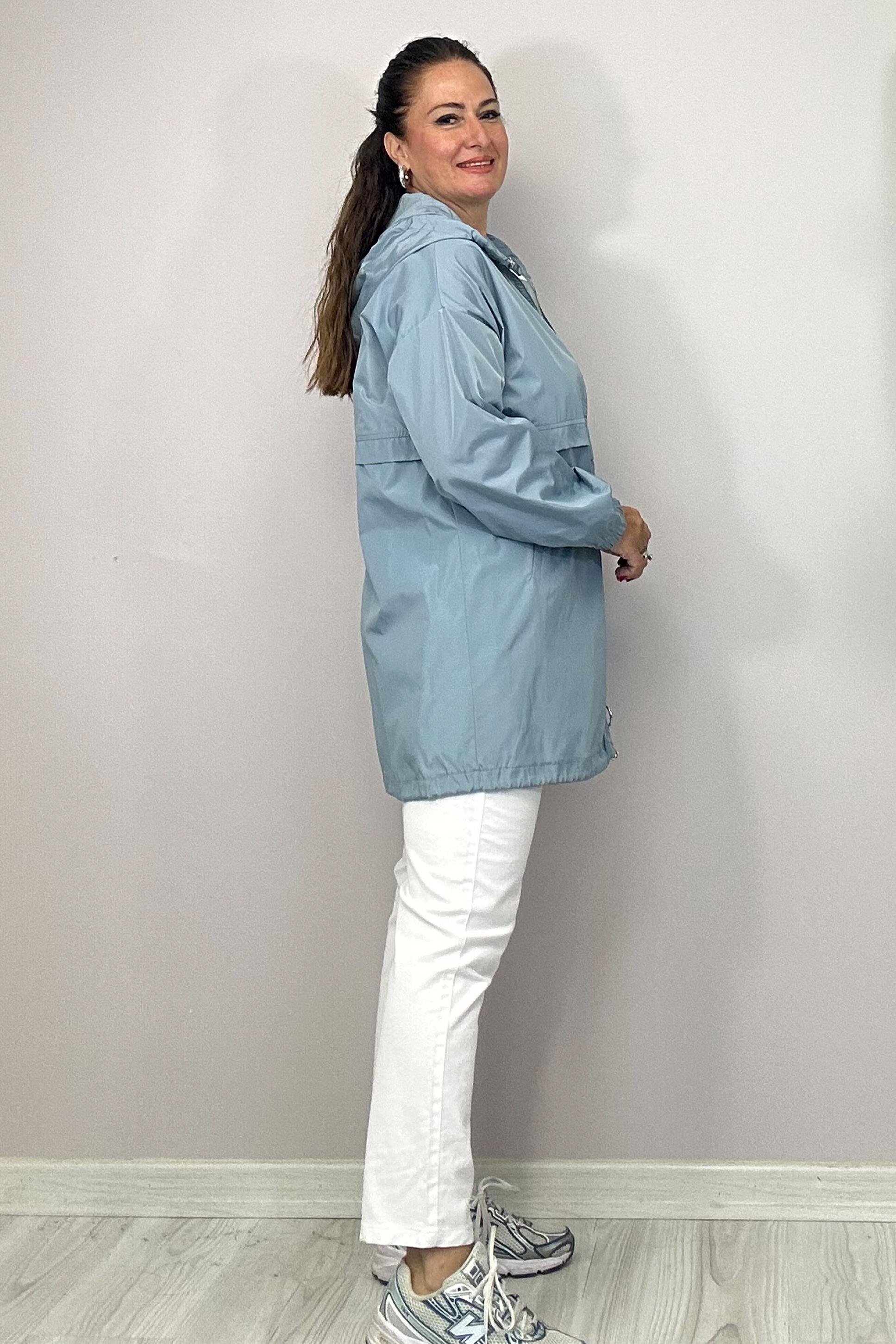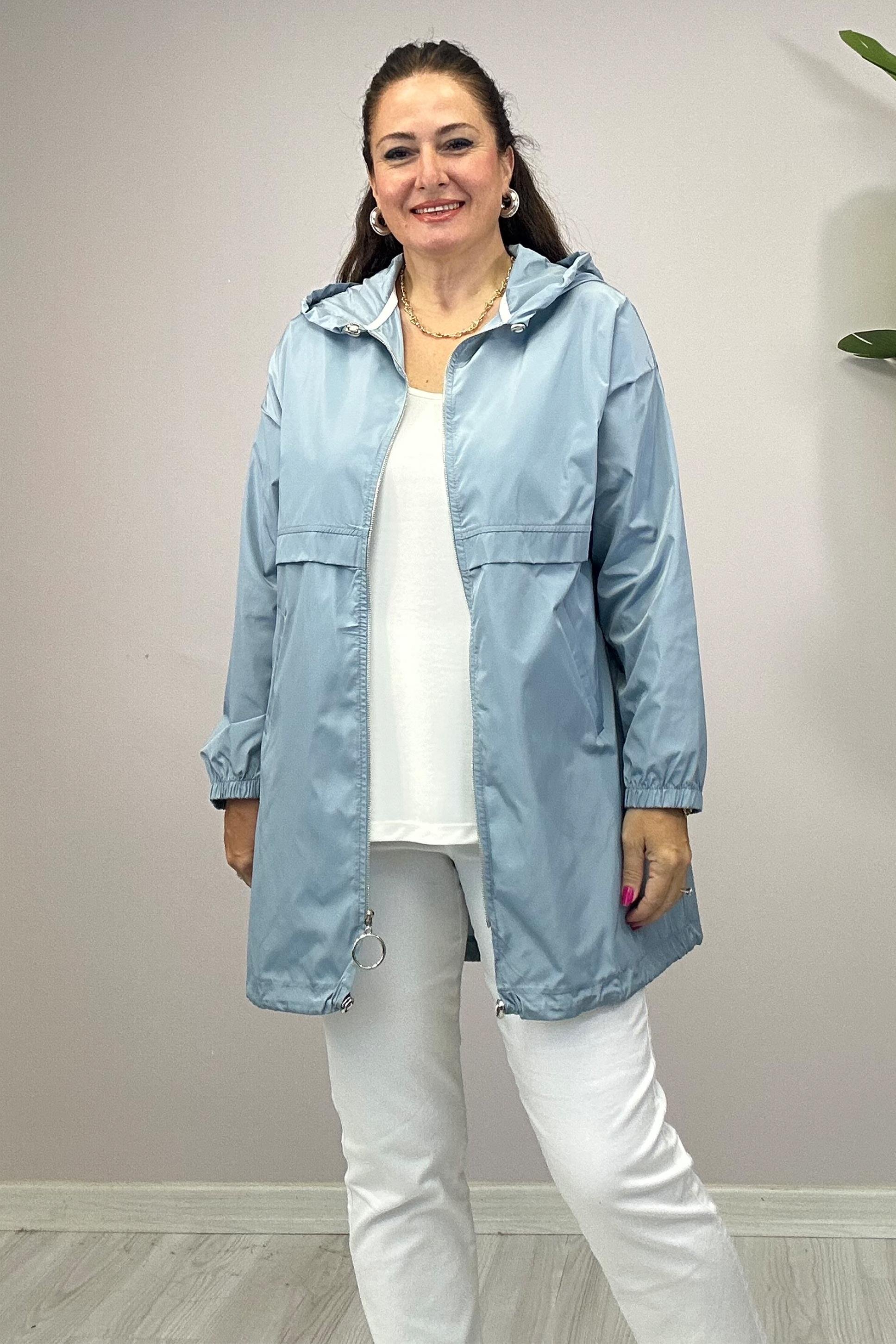 Fermuarlı,kapüşonludur. Etek ucu ip büzme detayı vardır.