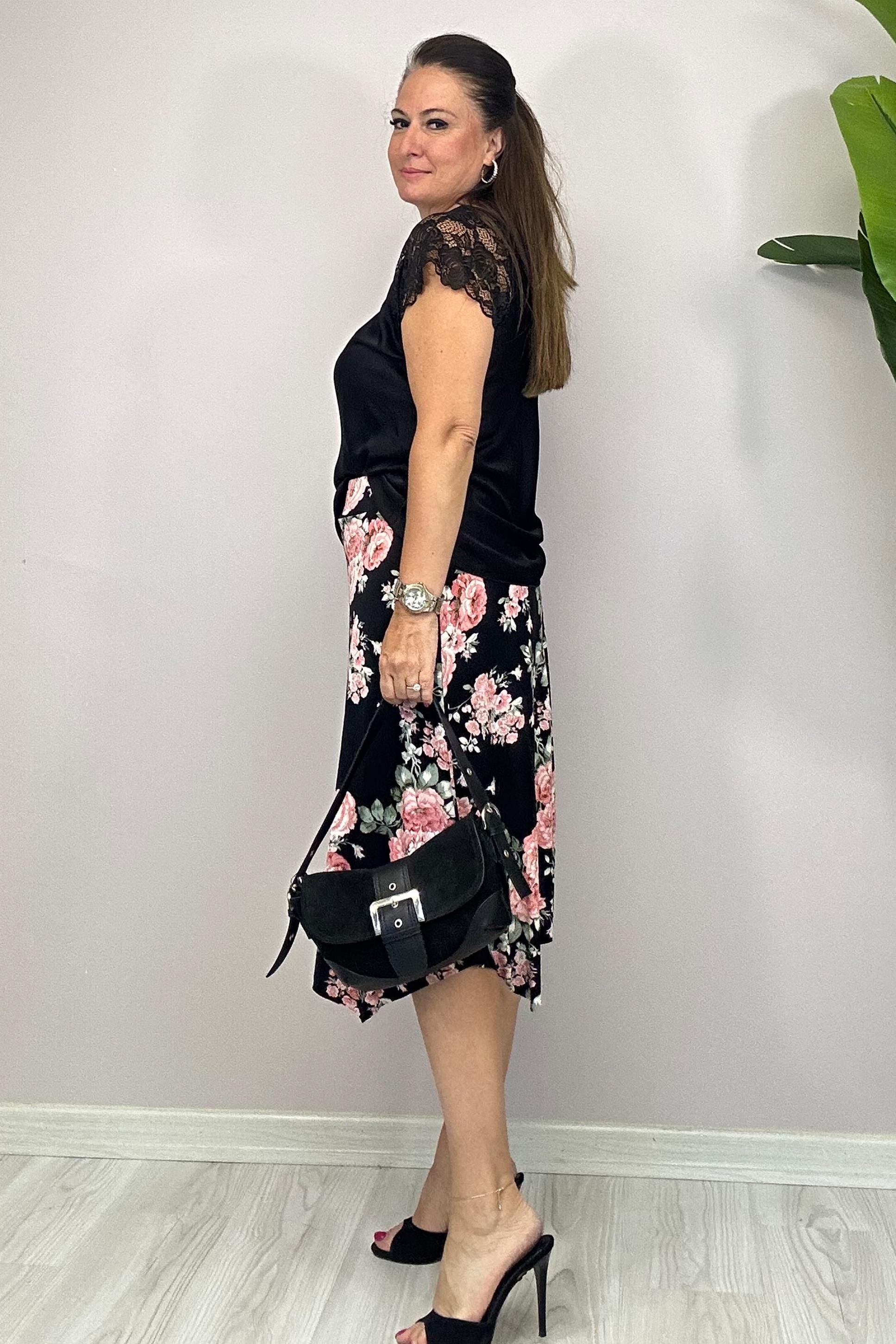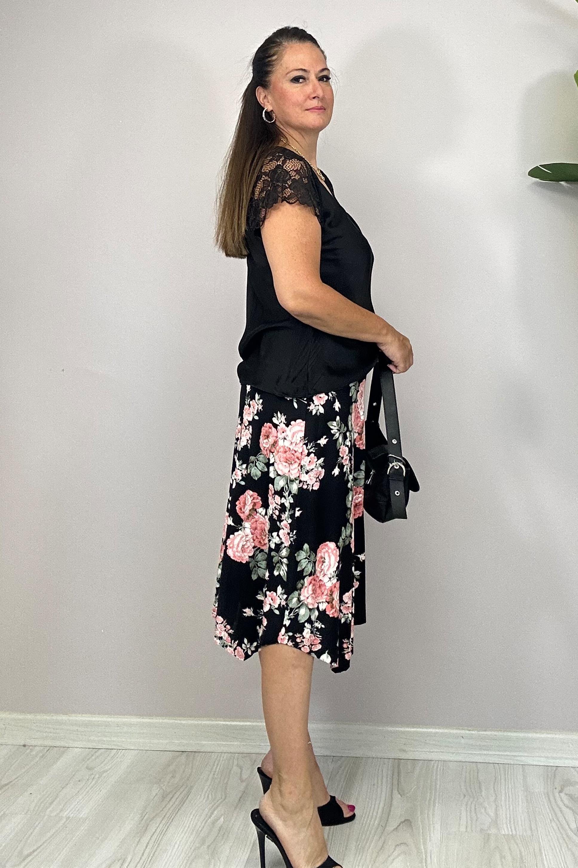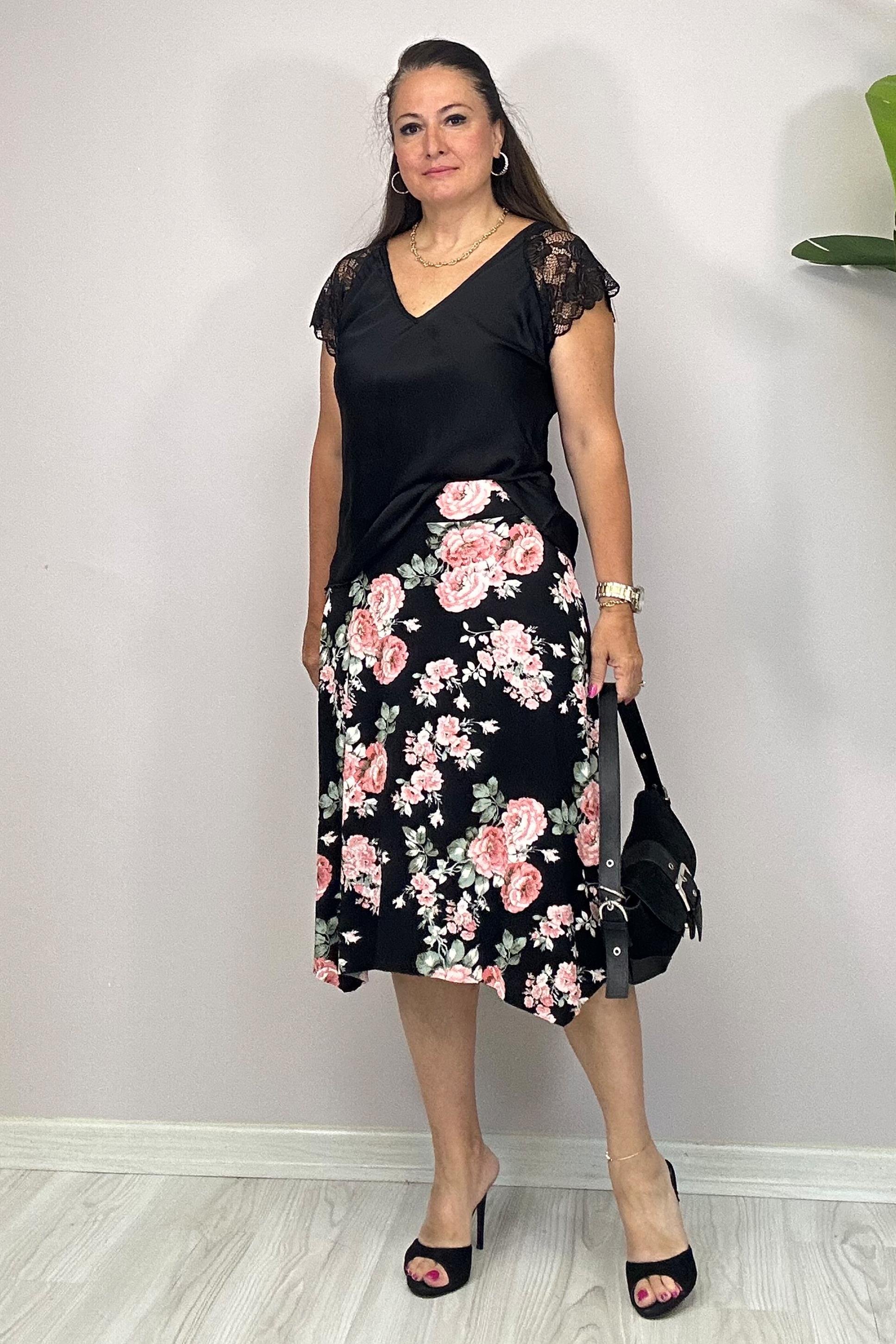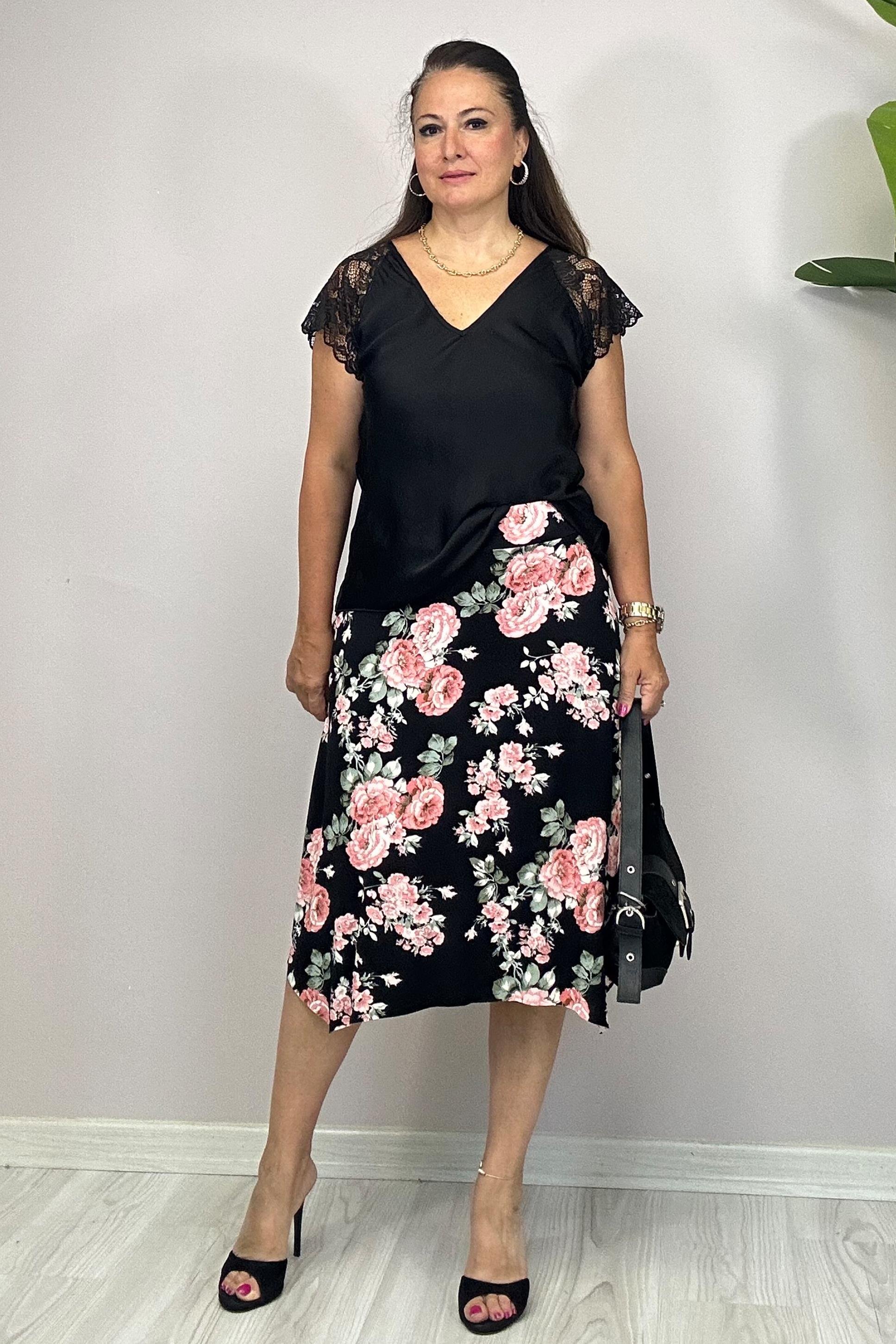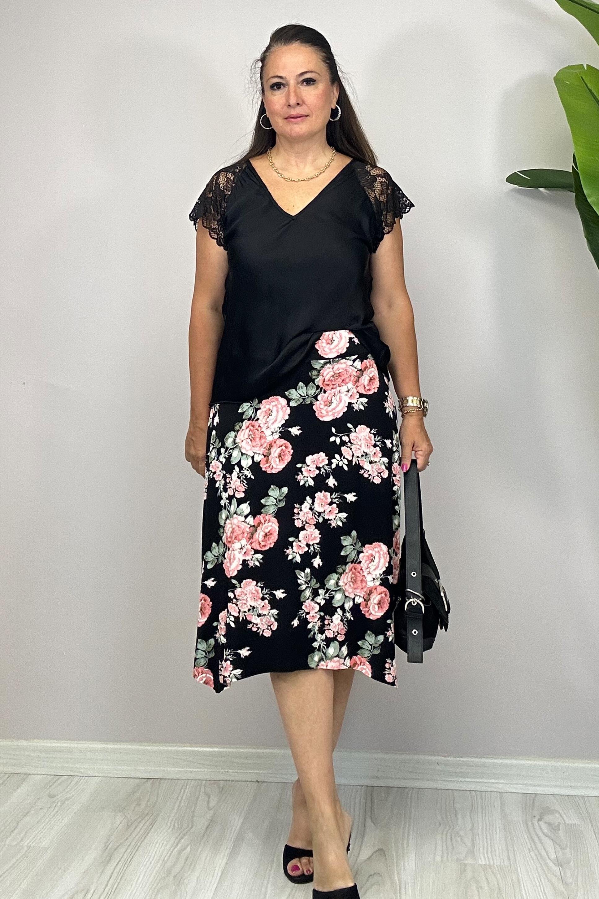 Viskon penye kumaştır. Beli lastiklidir. Asimetrik kesimdir. Small beden ölçüsü; Boy: 77 cm Basen: 134 cm Large beden ölçüsü; Boy: 78 cm Basen: 148 cm